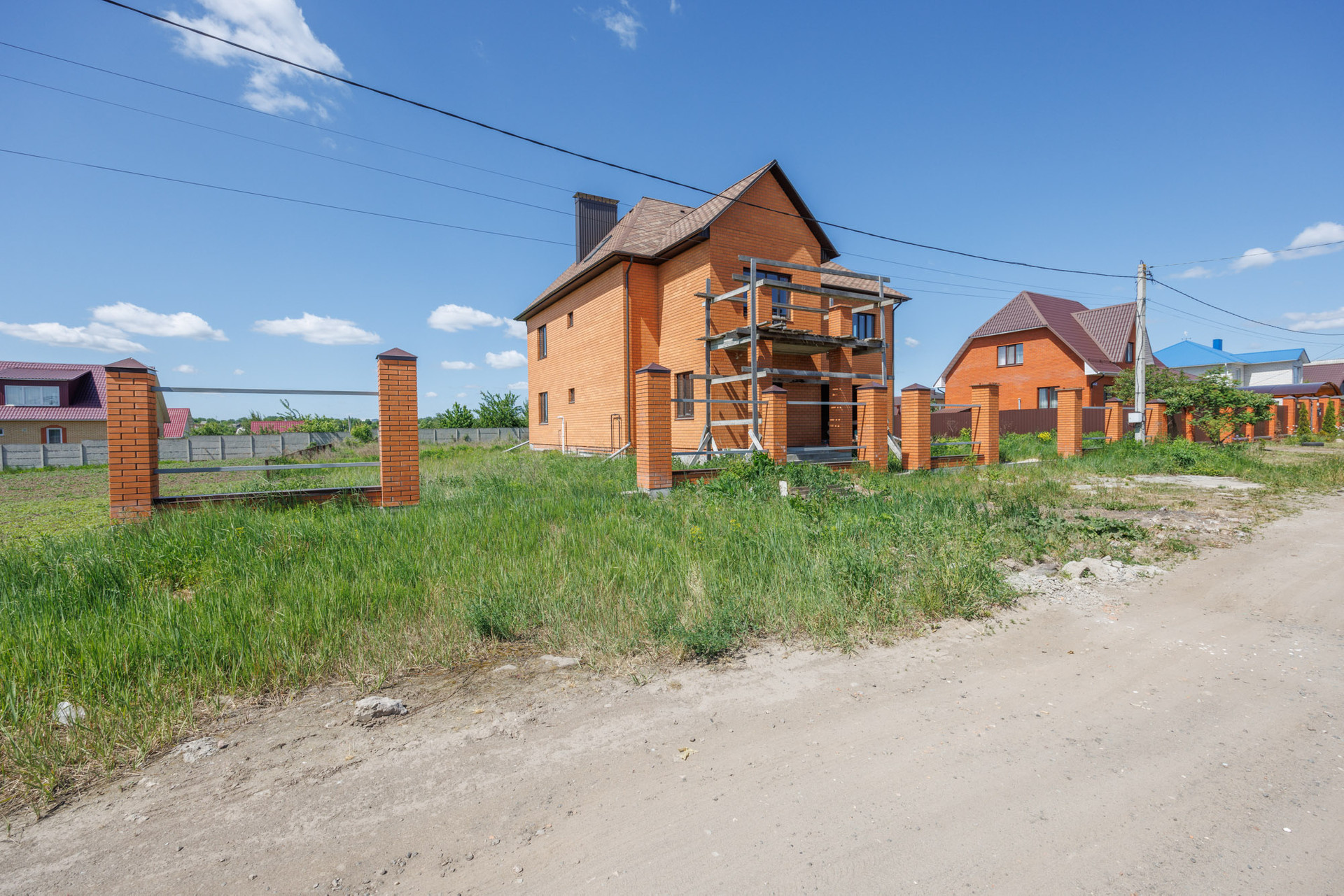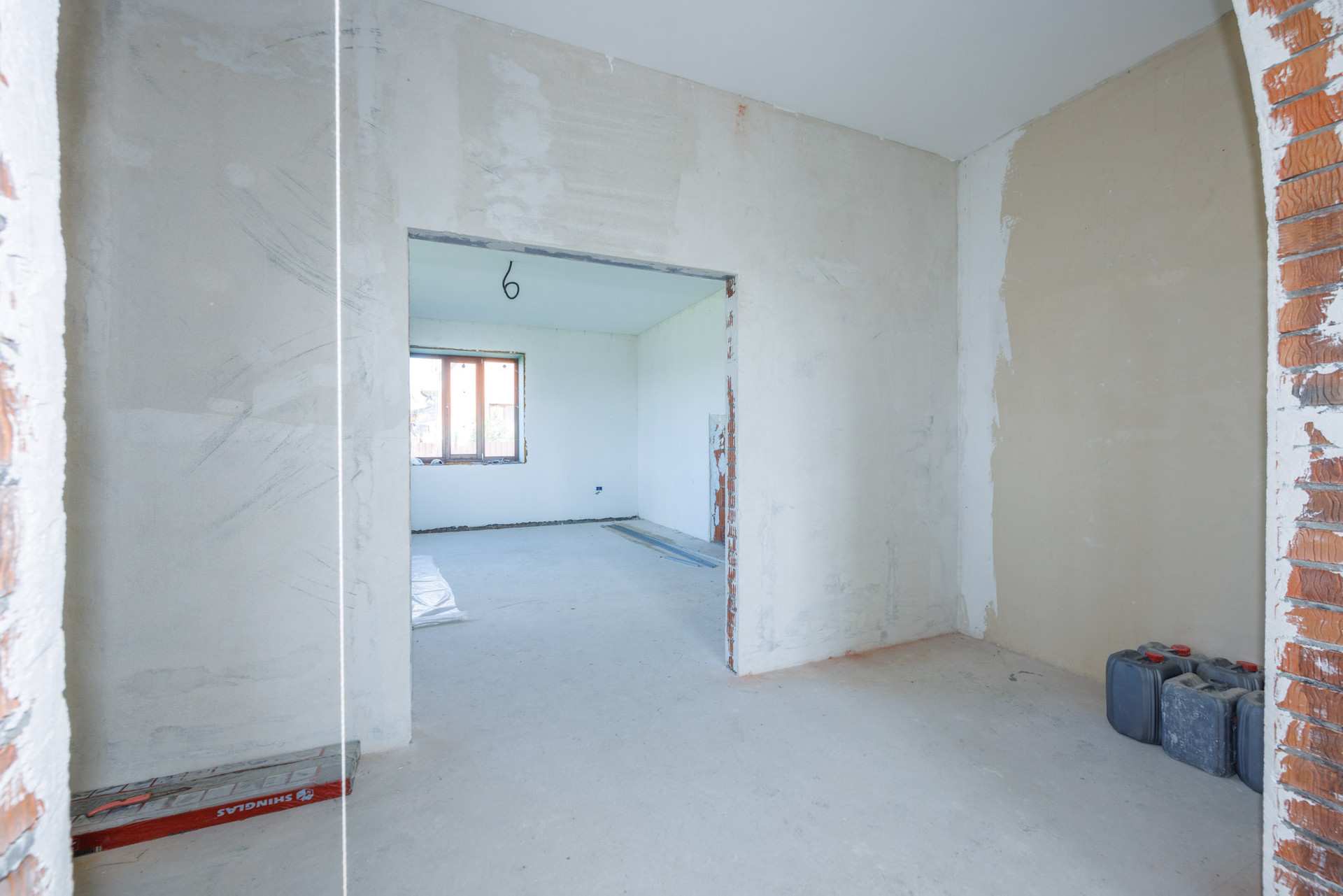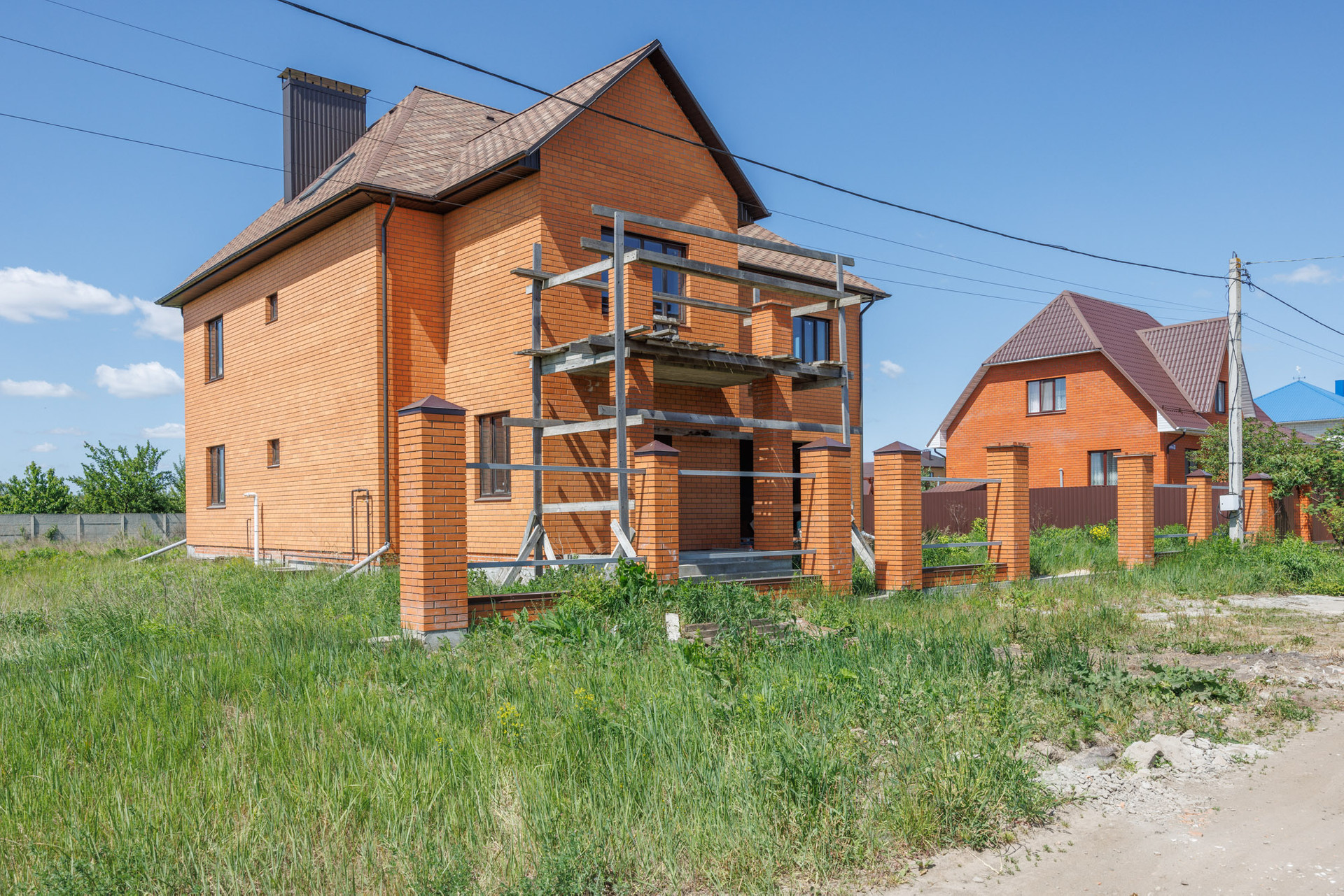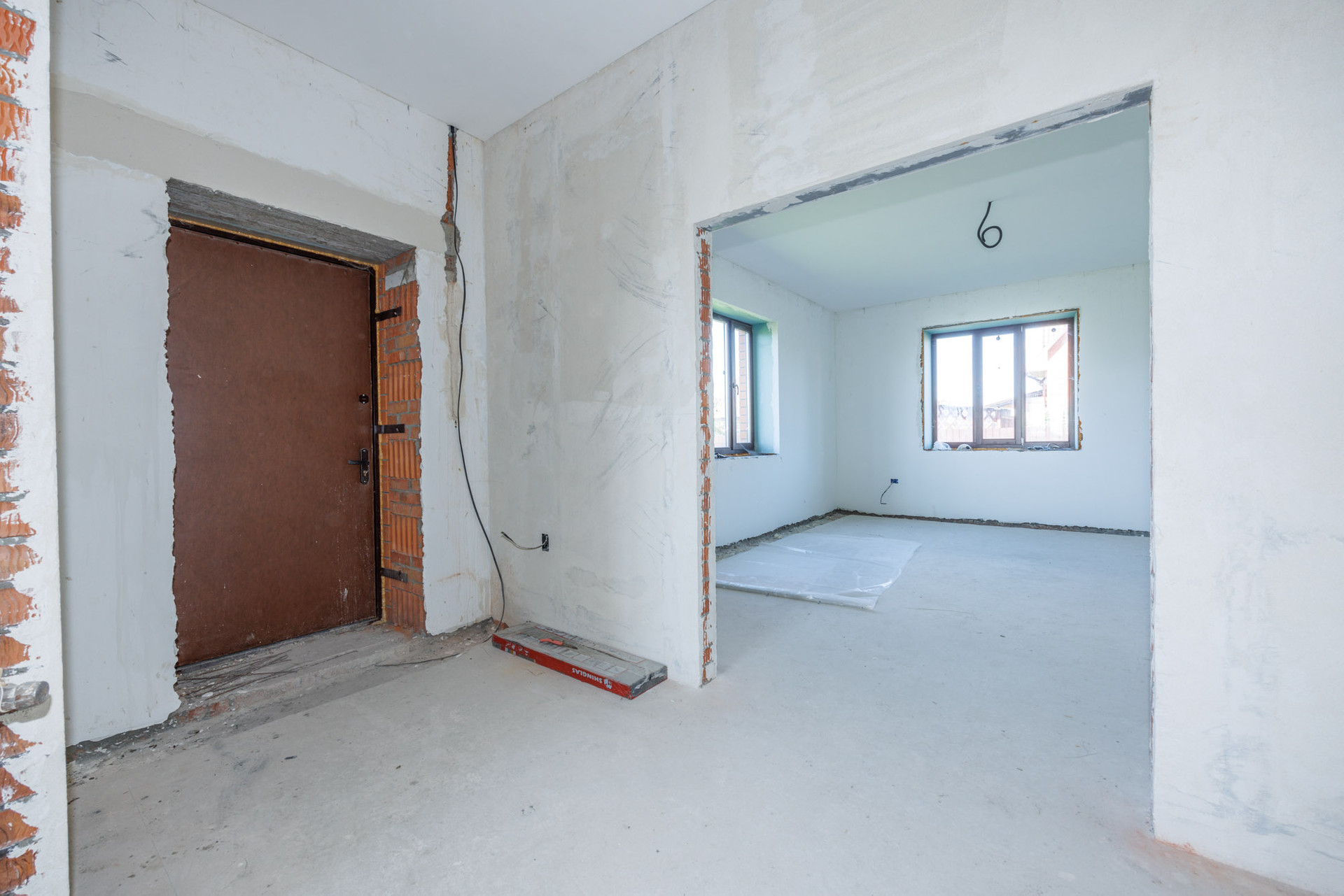 Дом в кирпичном исполнении: стены-керамоблок + красный кирпич, окна ЕВРО, потолок по всему периметру дома около 3.0 м., стены отштукатурены, подведена электрика, подведен газ ✔