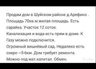 Продам дом в Шуйском районе д.Арефино .Площадь 90кв.м жилая площадь. Есть сарайка. Участок 12 соток.Канализация и вода есть прям в доме. К Газу можно подключится. Огромный вишнёвый сад. Недалеко есть озеро ~5-6км. Дом требует ремонта. 600т.р или можно под МАТ.КАПИТАЛ. Обмен. |