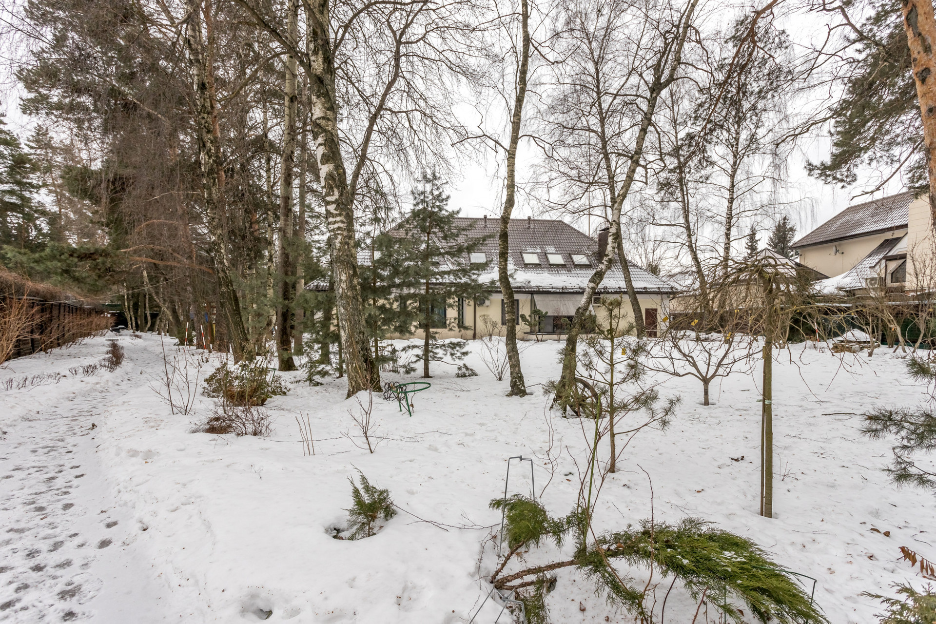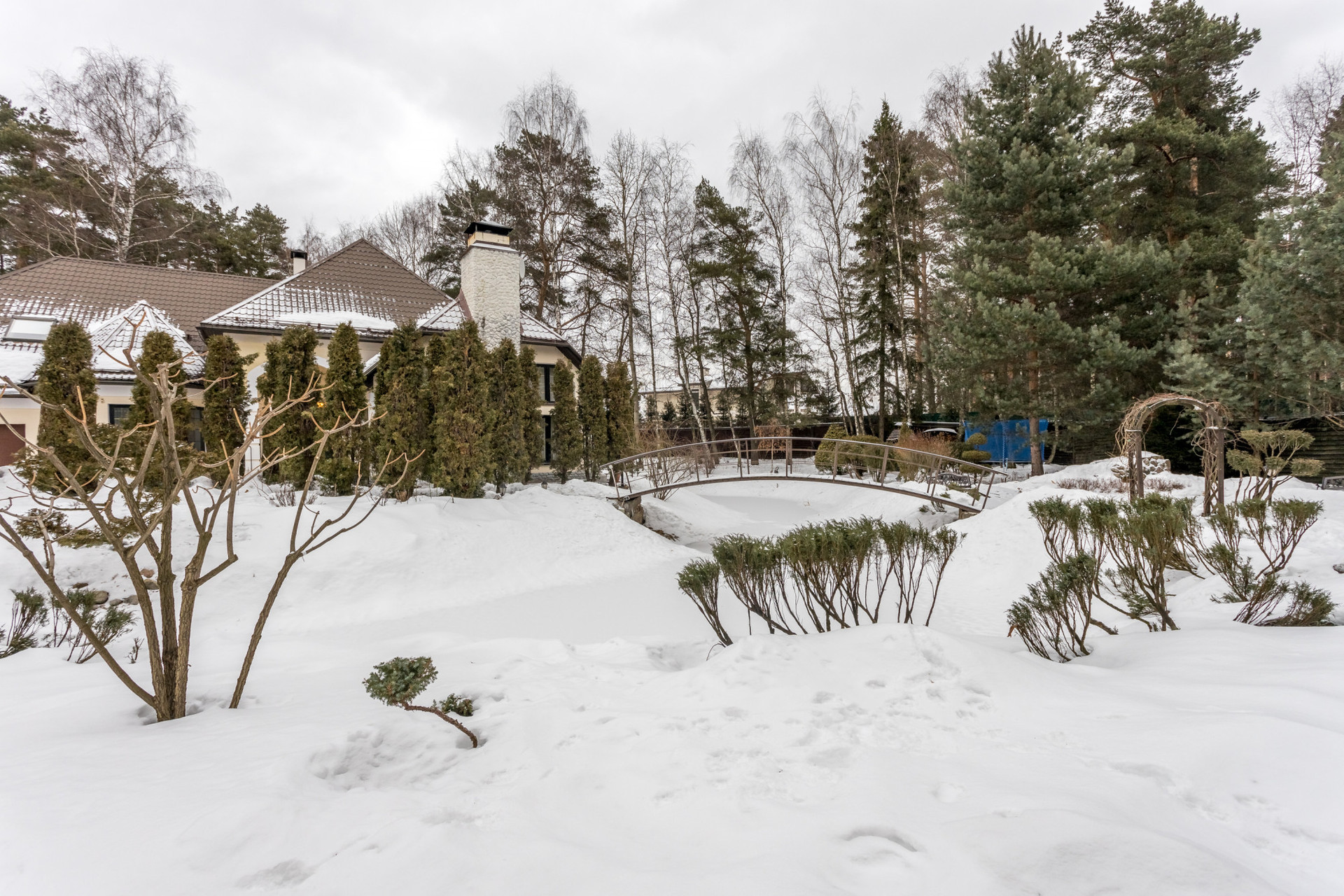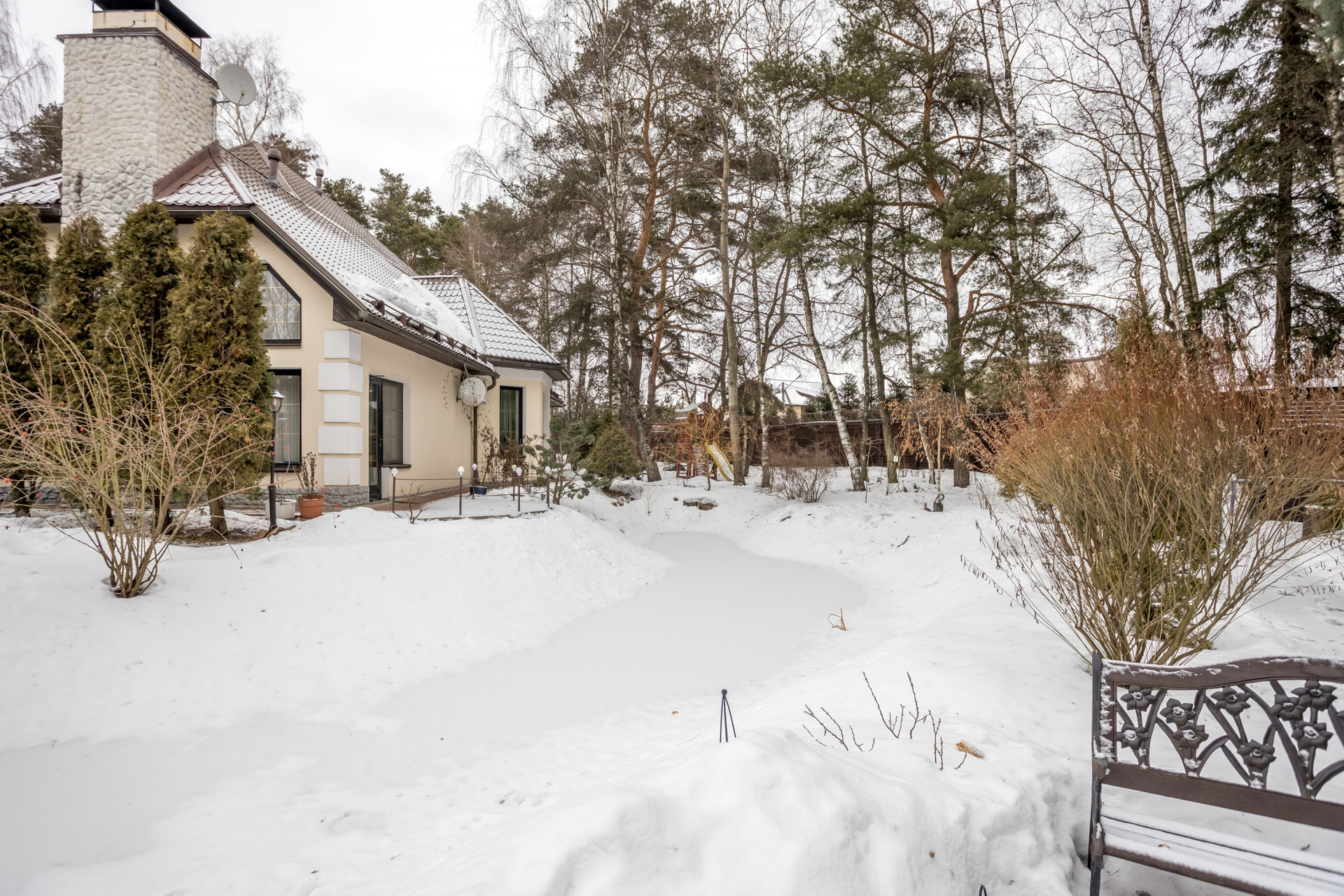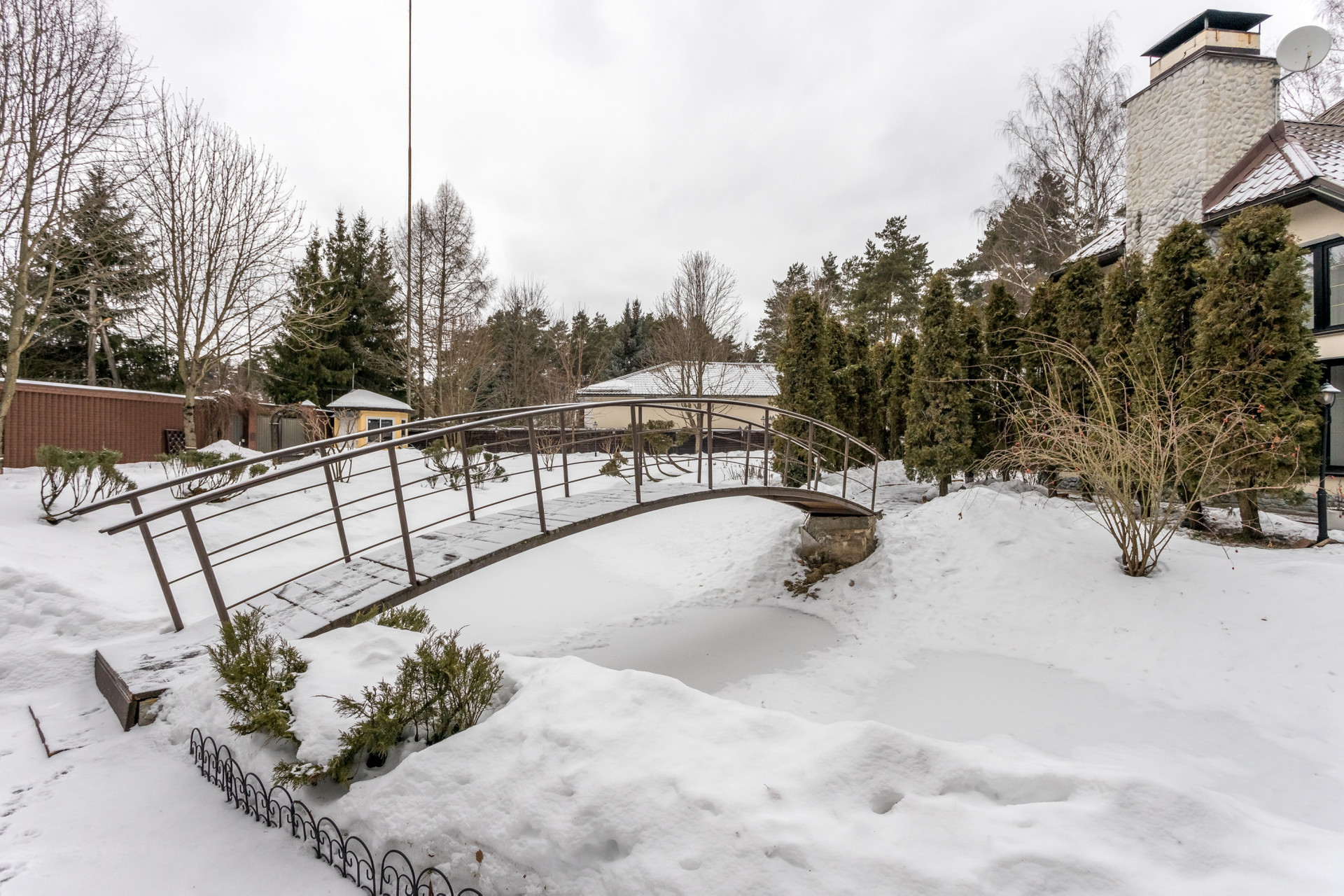 На участке выполнен ландшафтный дизайн, имеется свой небольшой пруд. Высажены кустарники, цветы, лиственные, хвойные и плодовые деревья. Дорожки вымощены плиткой, посажен газон. Также на участке: альпийская горка, детская площадка, вольер для собаки, теплица, открытая парковка, постройка для помощника, хранение садового и хозяйственного инвентаря, беседка с зоной барбекю.