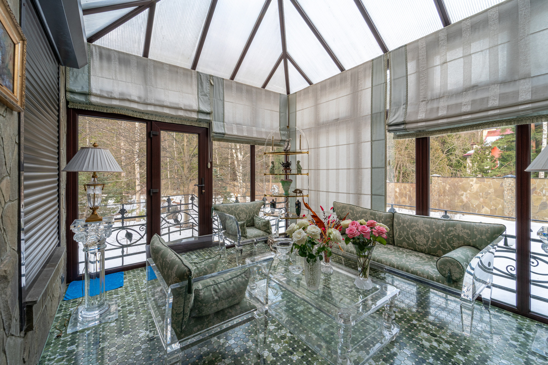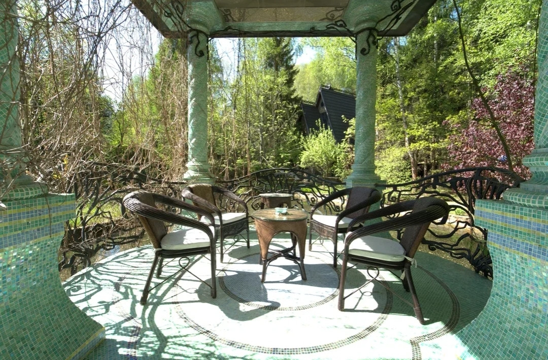 Уникальный ландшафтный дизайн территории насыщен и максимально растворен в естественной природе. Крыша дома медь – чешуйки ручной работы. Высокое, надежное ограждение. На въезде - дом охраны с вольером и теплым помещением для собак. С двух сторон участка приличные соседи, с двух других - смешанный лес, природоохранная зона.