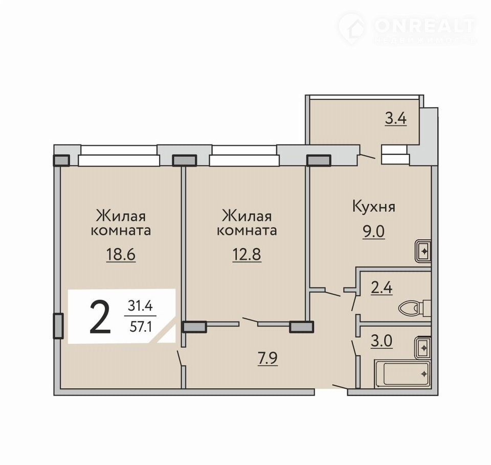 Общая площадь 57.1 м2