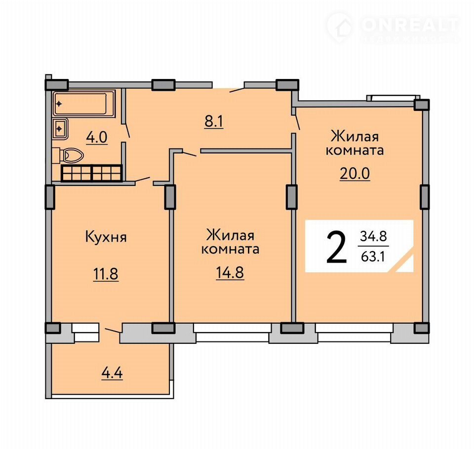 Жилая площадь 34.8 м2