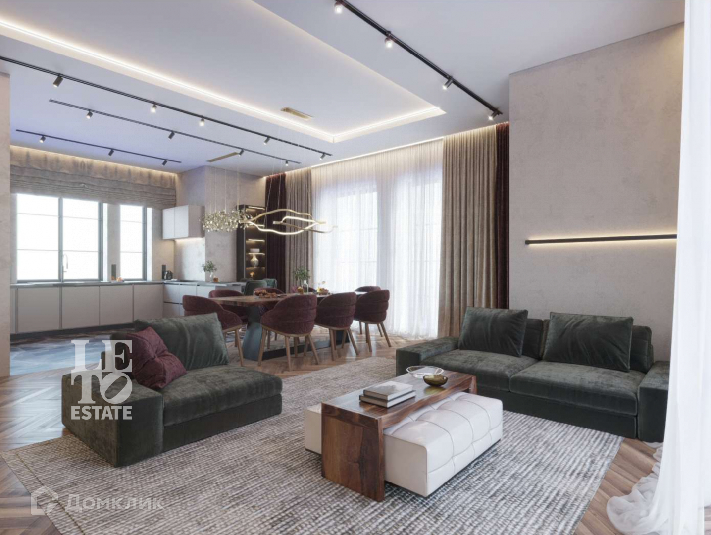 Продуманная планировка включает в себя просторный зал с обеденной зоной с выходом на застекленную террасу, большую кухню, шесть комфортных спален, обеспечивая достаточное место для всей семьи и гостей. Высокие потолки, достигающие 3,3 метра, и большое количество окон придают помещениям простора и воздушности.