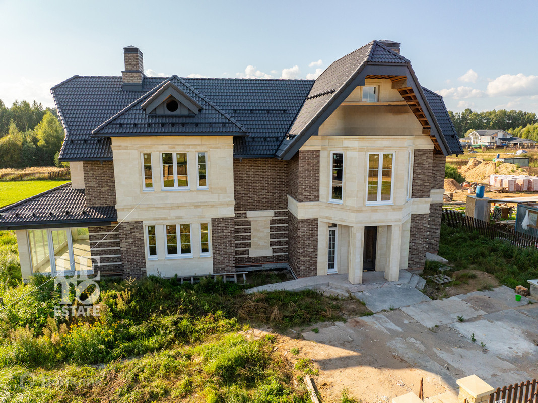 Дом построен в 2022 году из кирпича Porotherm на монолитном фундаменте, сделаны монолитные перекрытия, крыша – металлочерепица, установлены снегозадержатели, отделка клинкером и натуральным камнем.