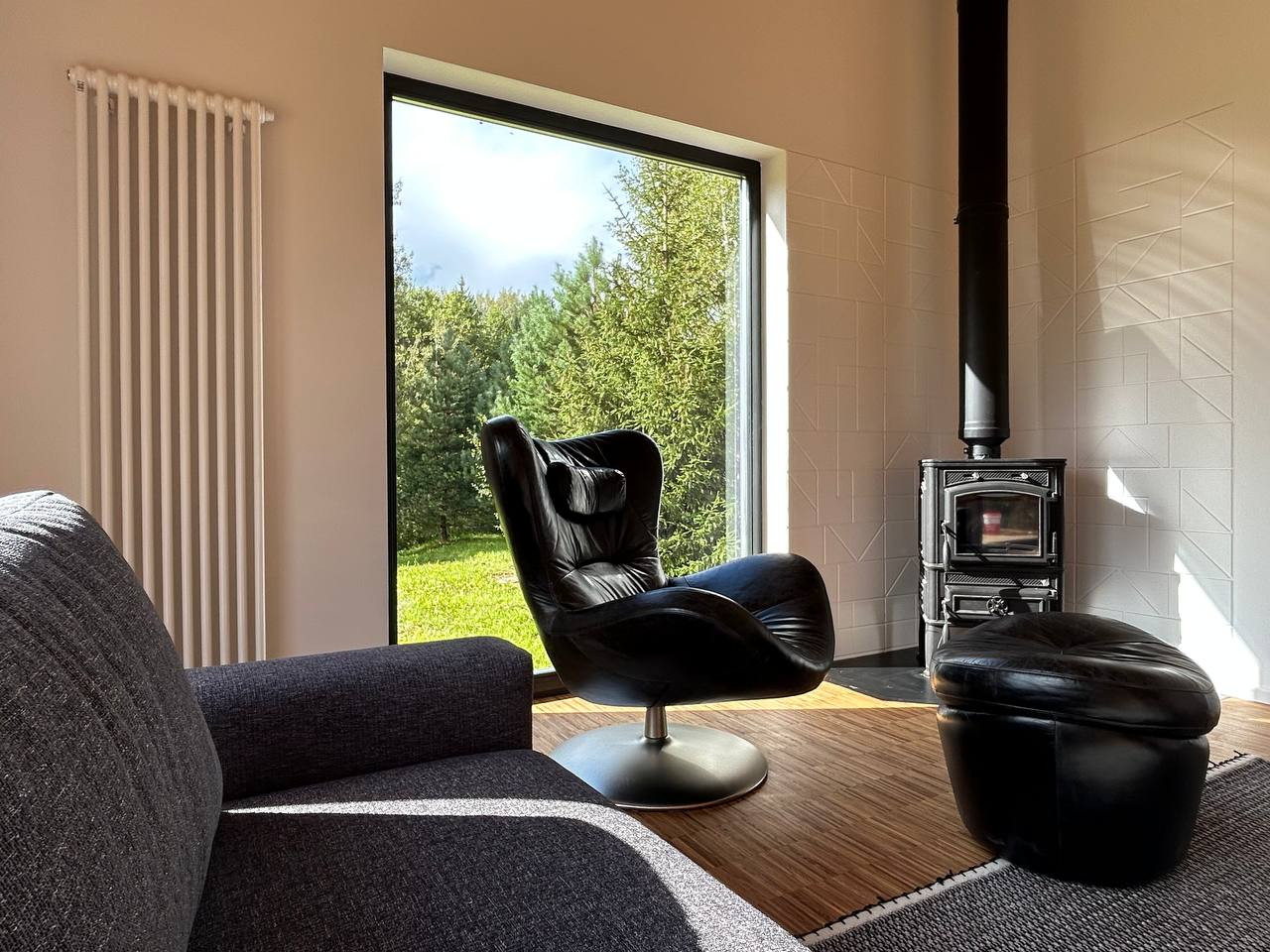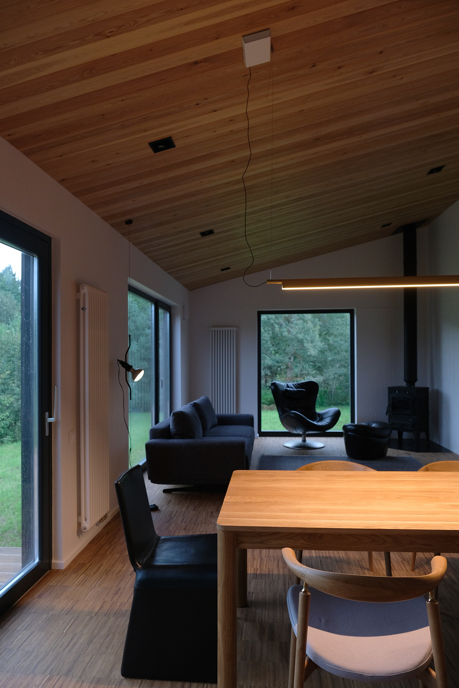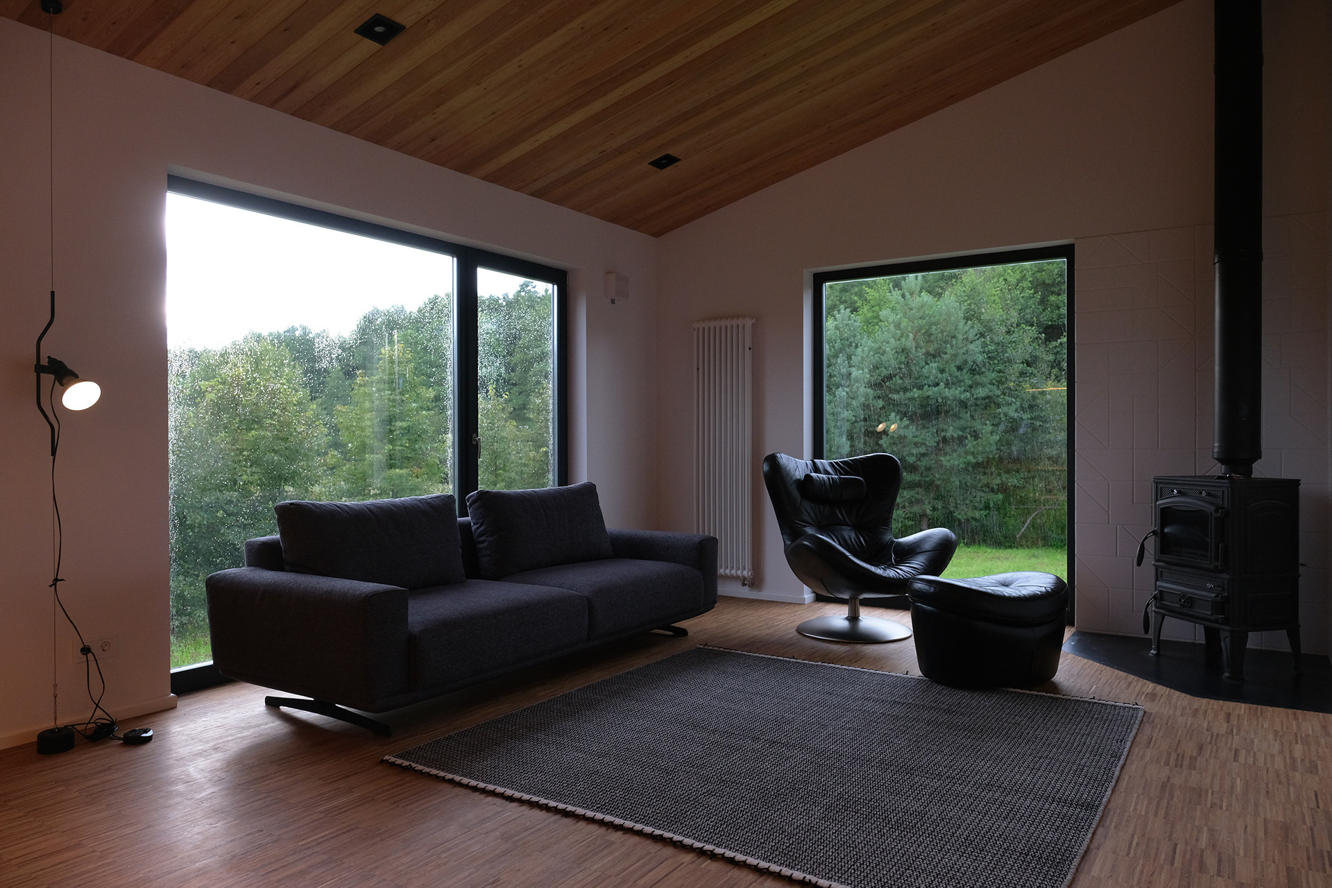 Обшивка лиственницей, фальцевая кровля, деревянные стеклопакеты в том числе портальный выход на улицу, дубовый паркет, фирменный итальянский свет Flos, скрытые двери высотой 230 см, мебель брендов Natuzzi, Porro, Porada и т д .