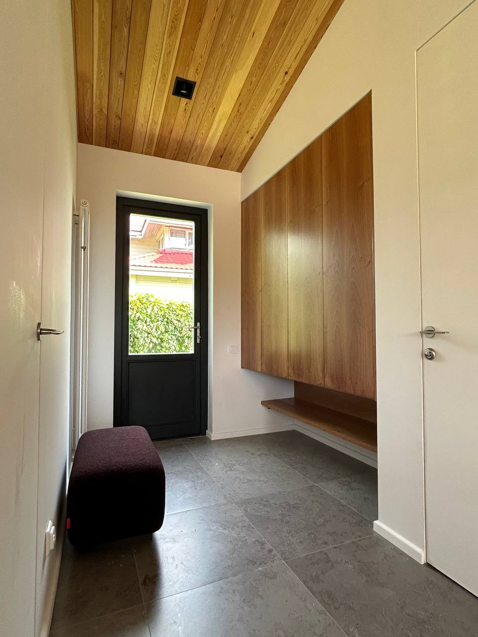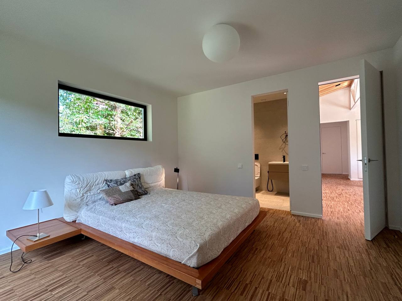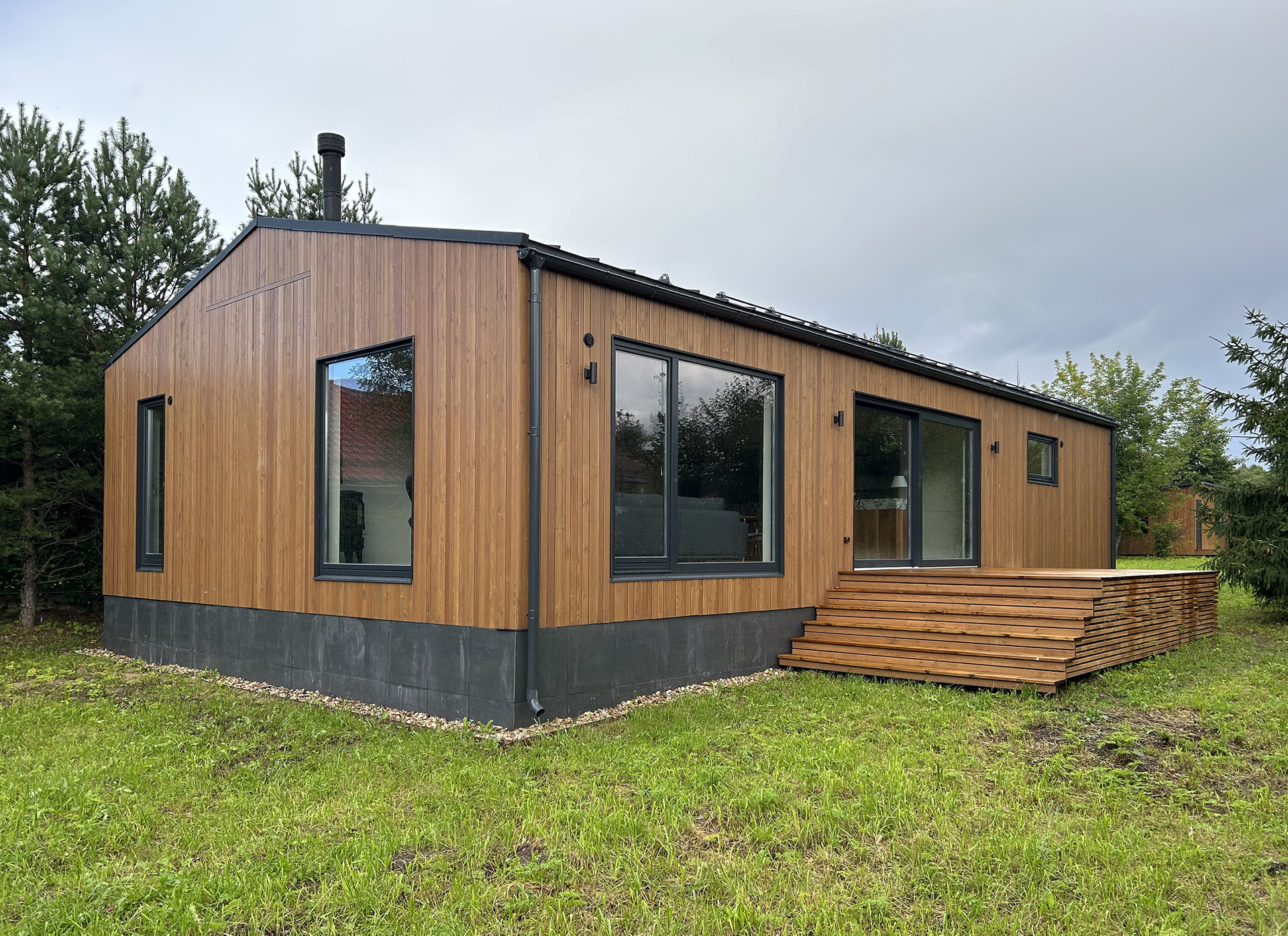 Обшивка лиственницей, фальцевая кровля, деревянные стеклопакеты в том числе портальный выход на улицу, дубовый паркет, фирменный итальянский свет Flos, скрытые двери высотой 230 см, мебель брендов Natuzzi, Porro, Porada и т д .