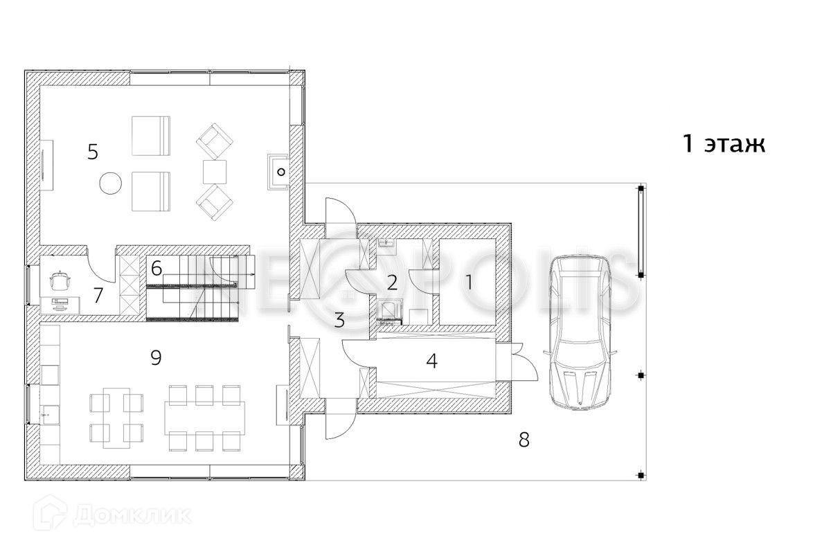 1 этаж: холл с выходом в отапливаемый гараж, кухня-столовая, гостиная с камином и выходом на крытую террасу, спальня, гардеробная, санузел.
