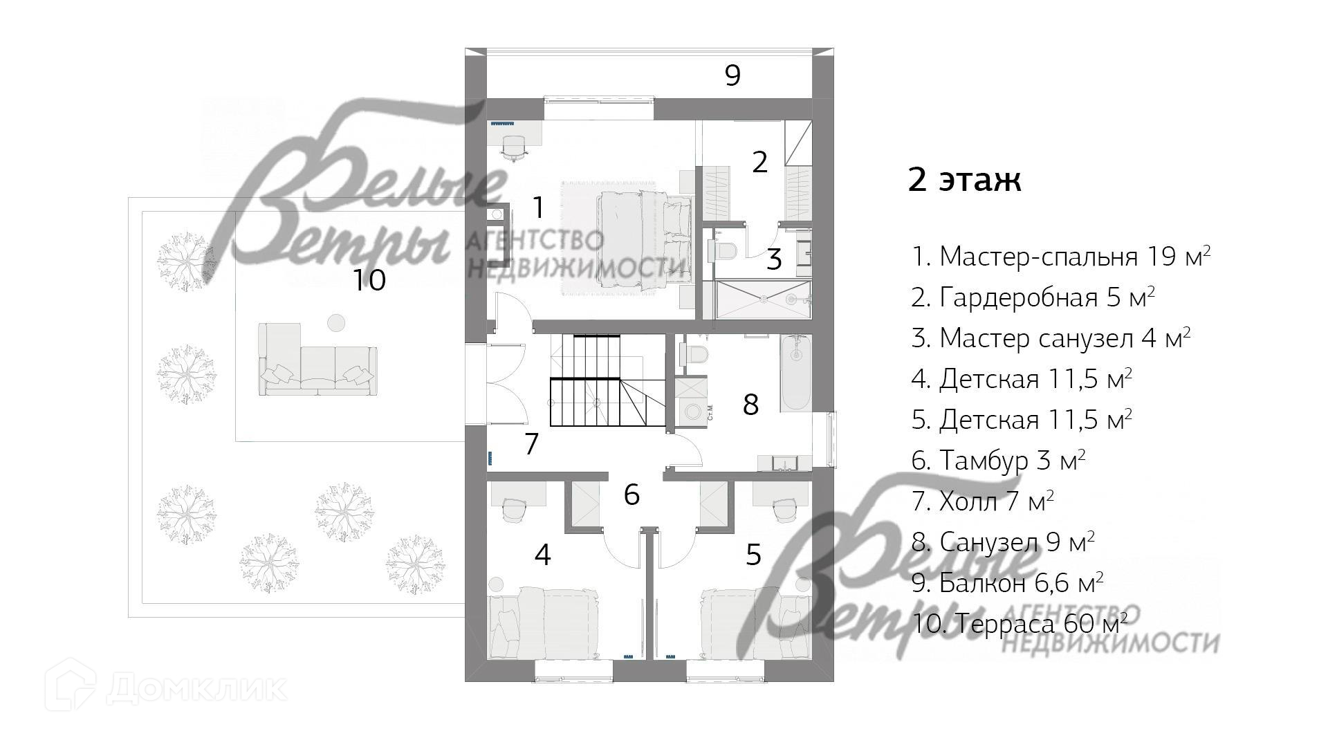 2-ой этаж: мастер-спальня 19 кв.м с санузлом 4 кв.м, гардеробной 5 кв.м и балконом 6.6 кв.м, спальня 11.5 кв.м, спальня 11.5 кв.м, санузел 9 кв.м, холл 7 кв.м, тамбур 3 кв.м, эксплуатируемая кровля 60 кв.м..