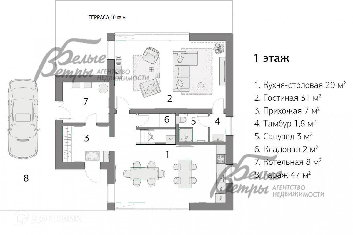 1-ый этаж: прихожая 7 кв.м, гостиная 31 кв.м, кухня-столовая 29 кв.м, кладовая 2 кв.м, санузел 3 кв.м, котельная 8 кв.м, навес для авто 47 кв.м..