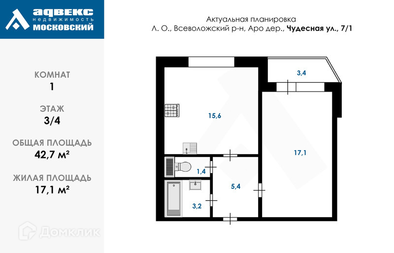 Общая площадь 42.7 м2