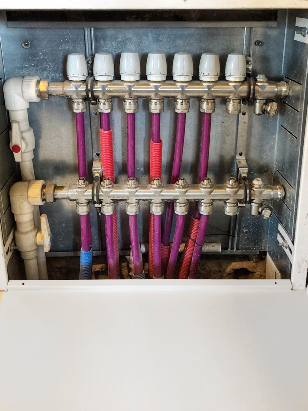 В доме разведены и подключены все коммуникации: электричество 20 кВа; ХВС, ГВС; канализация (септик тип Топаз); водяные тёплые полы Rehau; отопление (батареи); пилетный котёл (350 м2); вентиляция; интернет; спутниковое и городское телевидение.