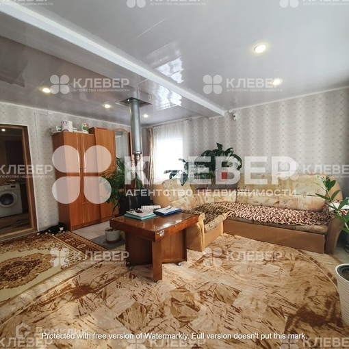 В зале 5 окон, все стеклопакеты, поэтому в комнате очень светло. На полу линолеум, на потолке панели и светодиодные светильники. Снаружи дома сделана обшивка деревянной вагонкой.