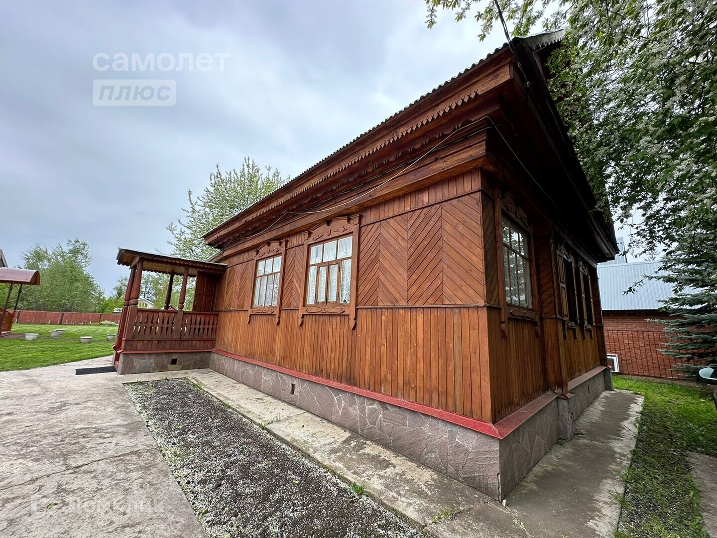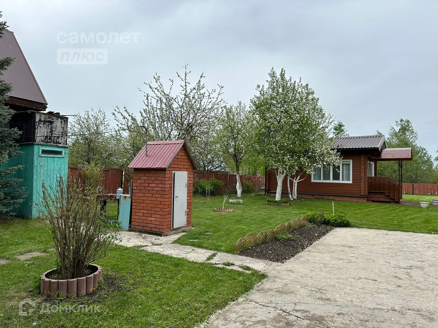 - На всем участке газон. Асфальт до дома.