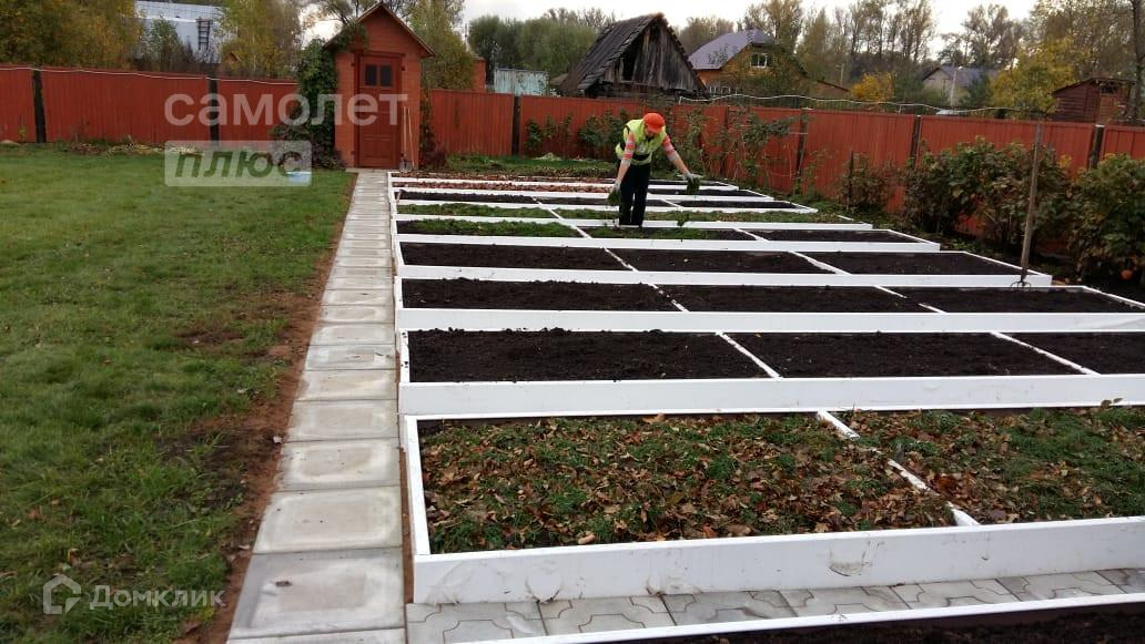 -огородная зона из 11 пластиковых грядок, обложенных по контуру плиткой,