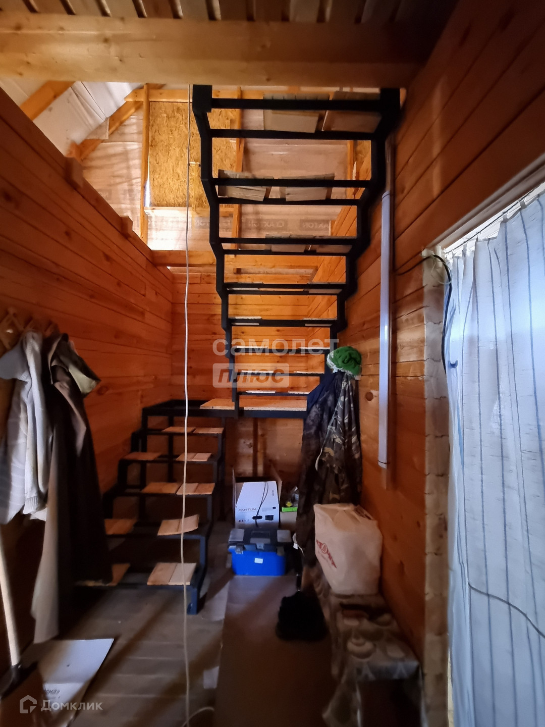 На первом этаже установлены пластиковые окна. На второй этаж ведёт металлическая лестница.