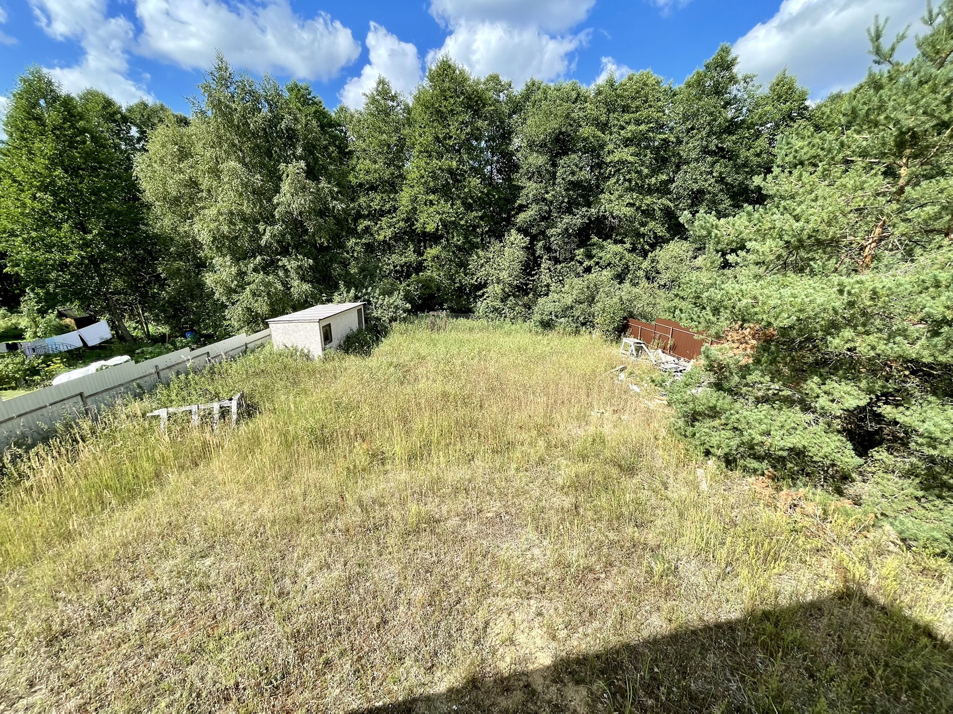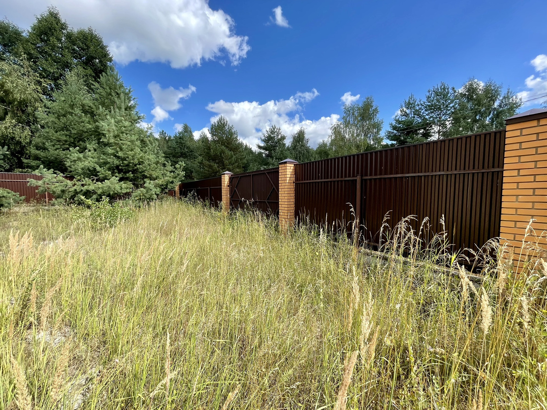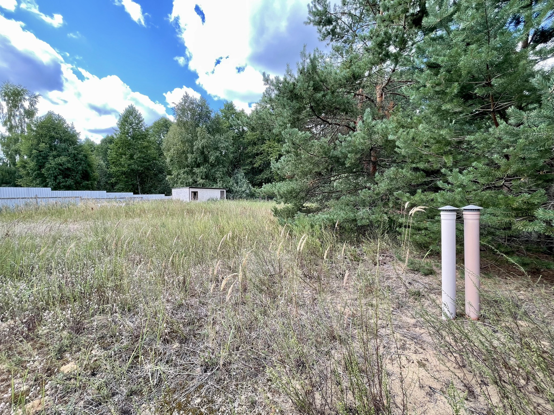 ✅ участок 10 соток, ровный, в окружении сосен, сухой, песчаный, огорожен по периметру, 30 метров по фасаду. есть ворота для въезда транспорта.