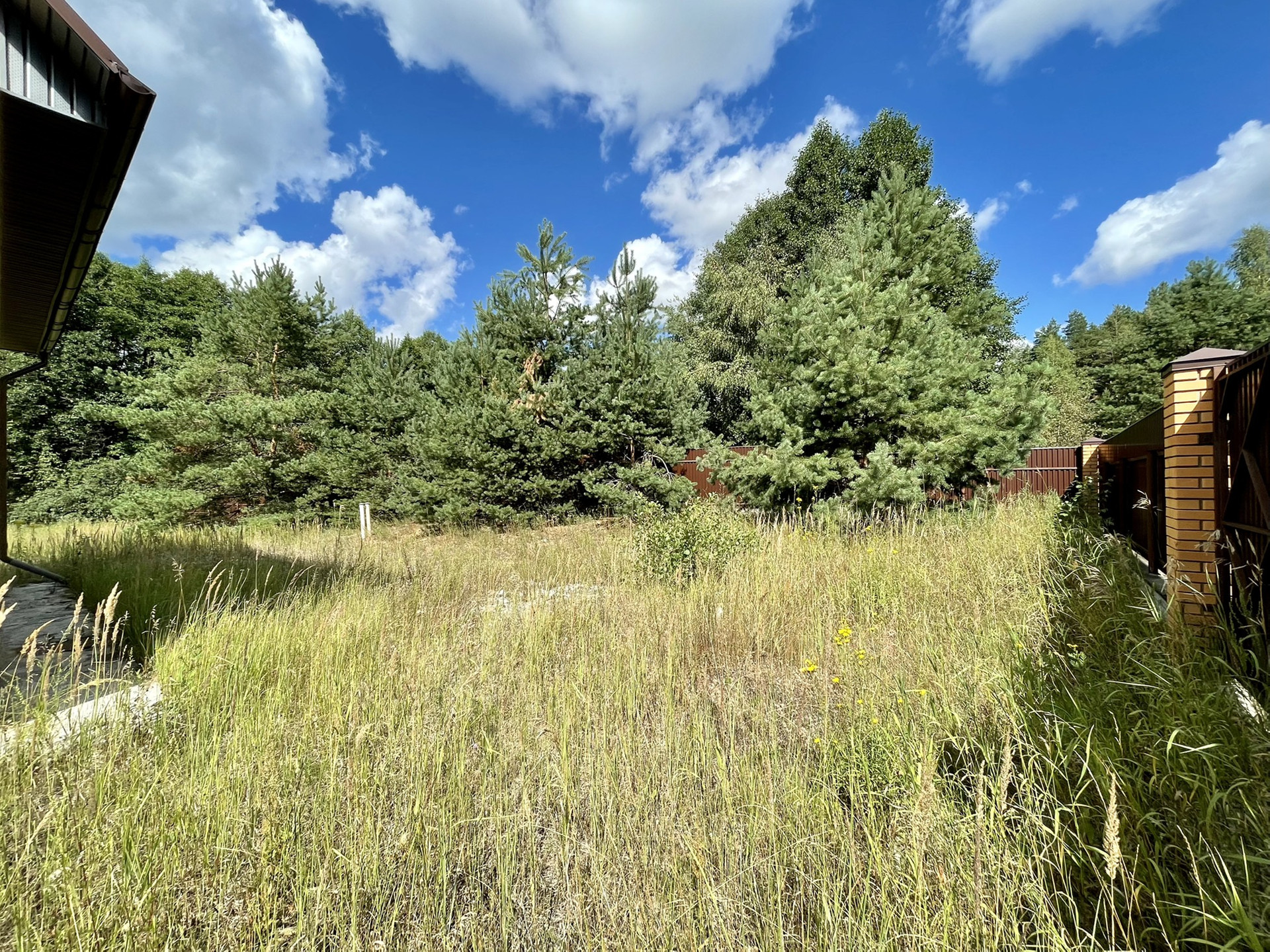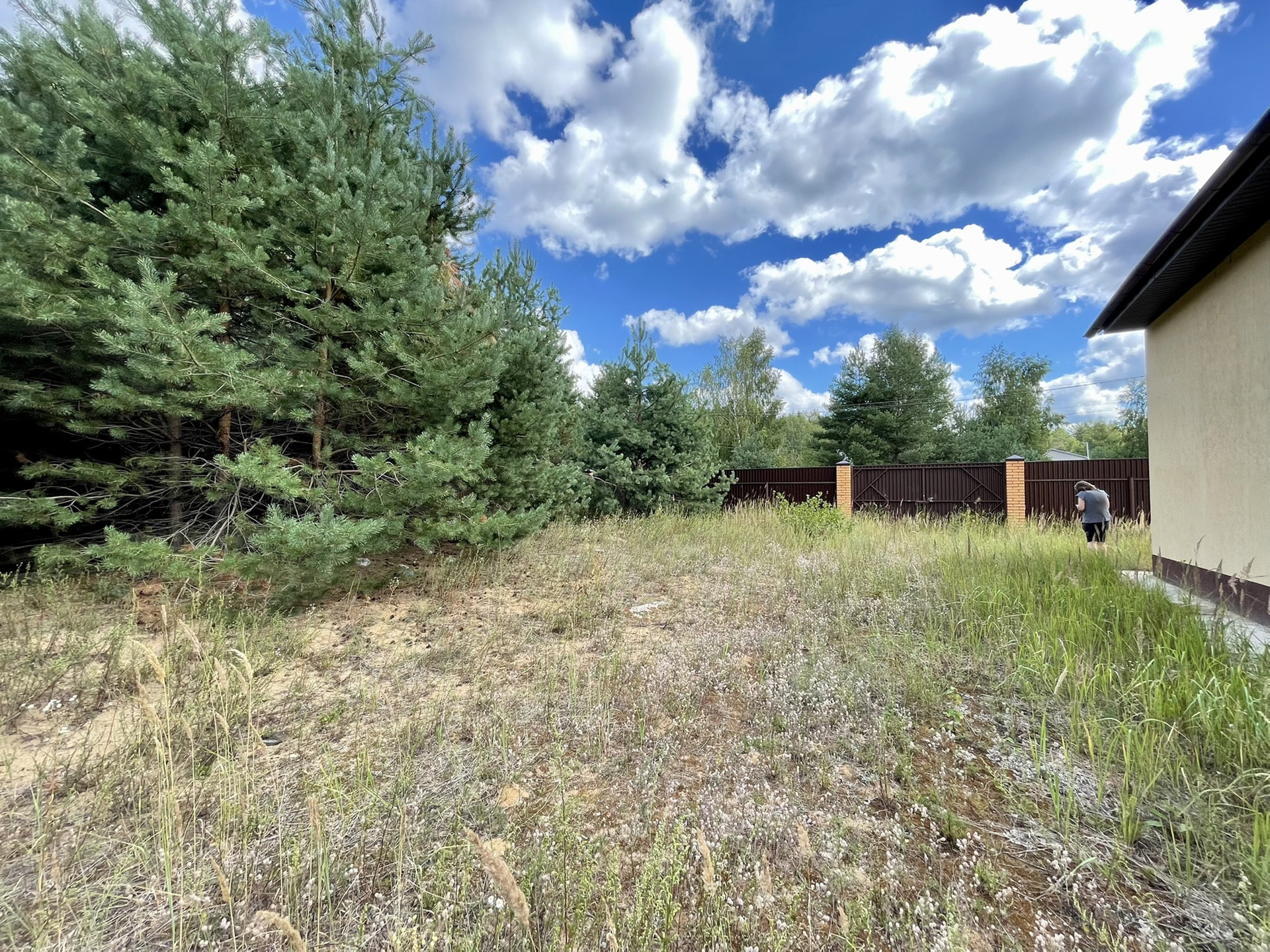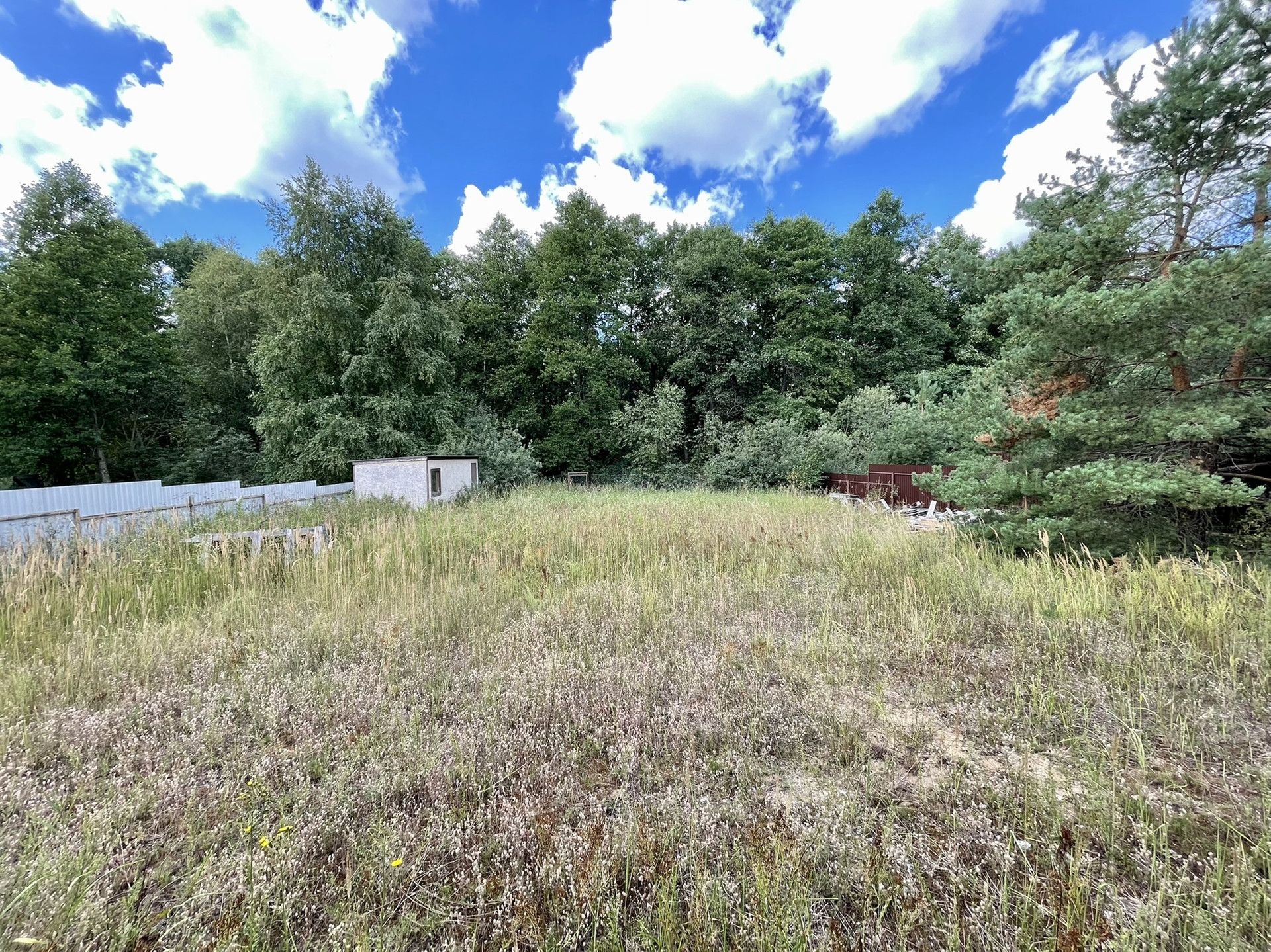 ✅ участок 10 соток, ровный, в окружении сосен, сухой, песчаный, огорожен по периметру, 30 метров по фасаду. есть ворота для въезда транспорта.