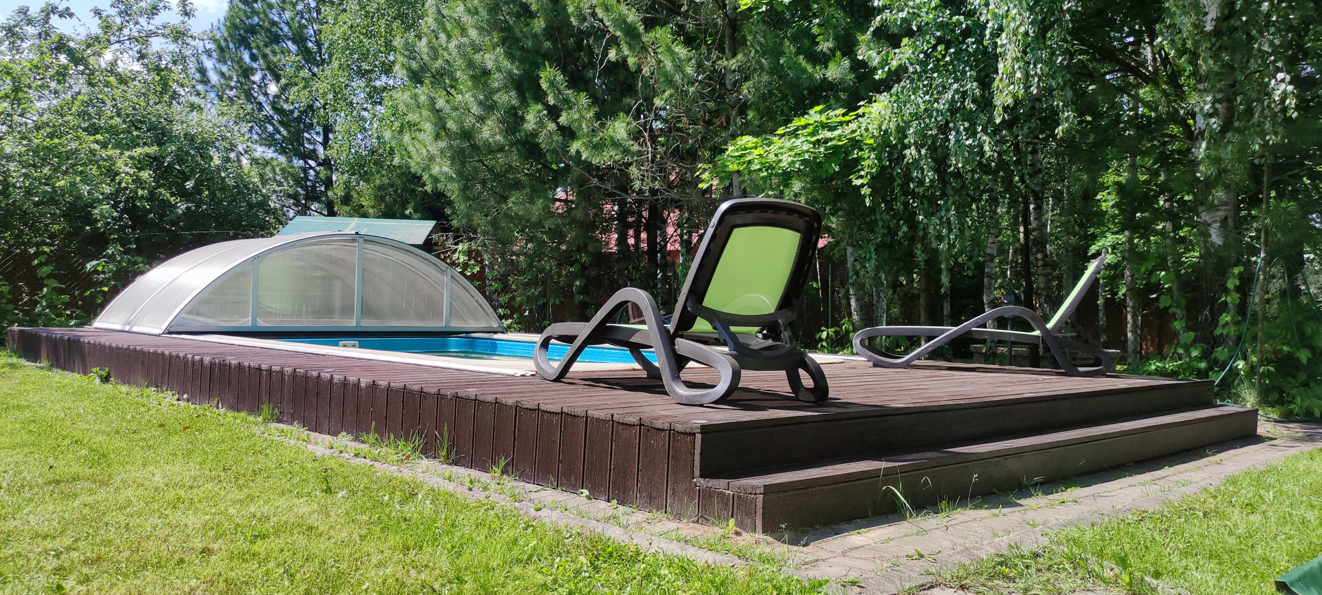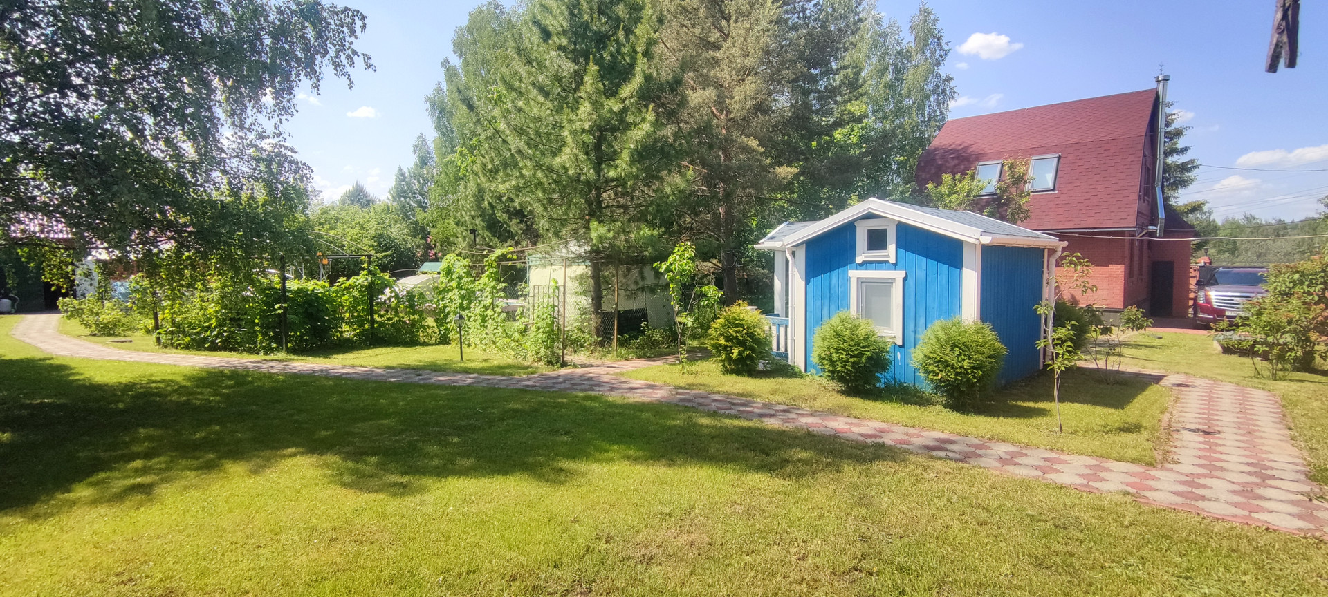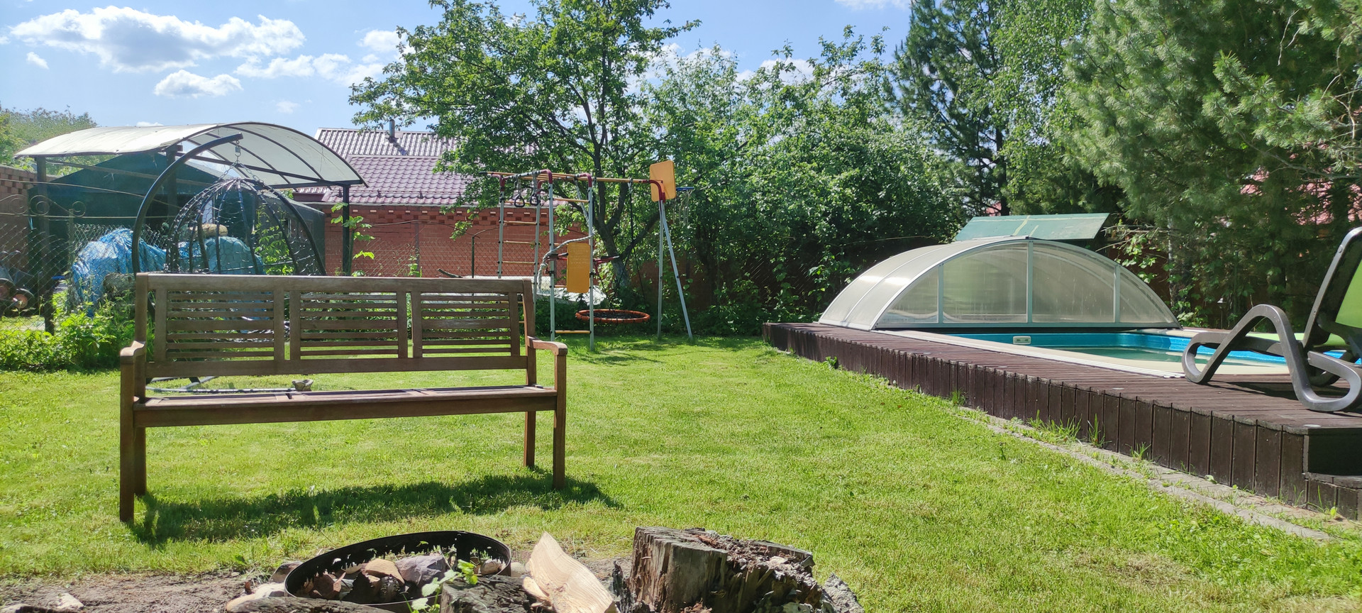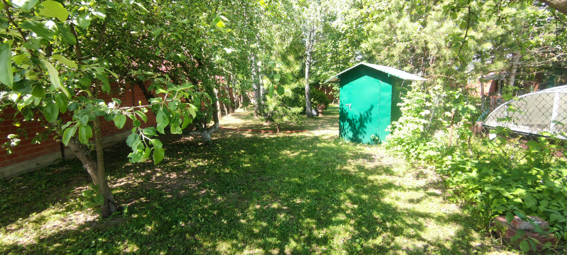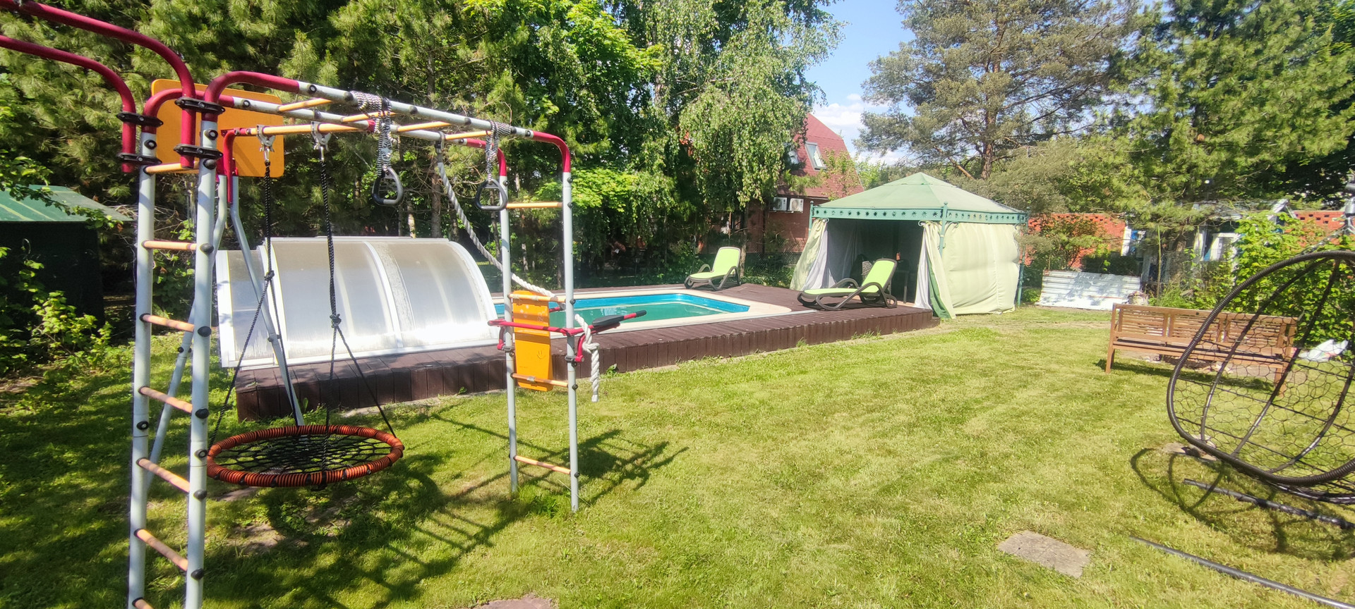 - участок: полностью обнесен кирпичным забором, сделаны Ливневые желоба, перед участком сделана Дренажная канава, щитовой детский домик: 2-х ярусная кровать, можно жить в летнее время, бассейн новый установлен качественный тент, новая водоподготовка, зона отдыха, шатер, лежаки, фонтан,