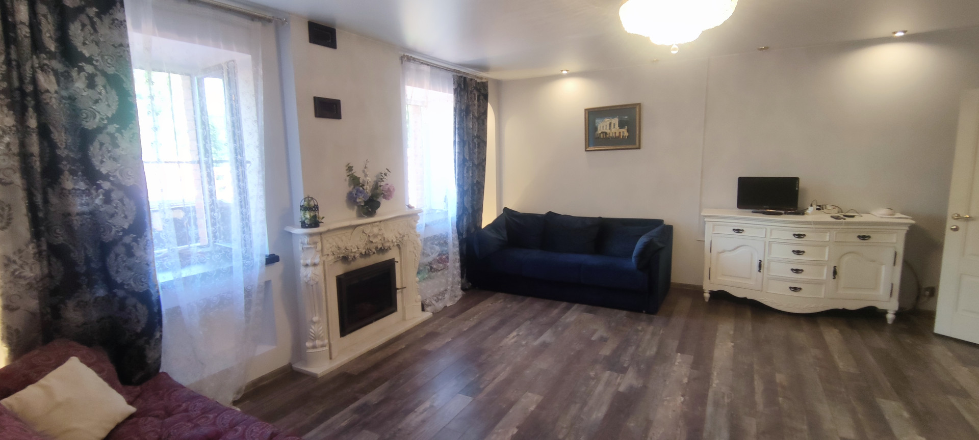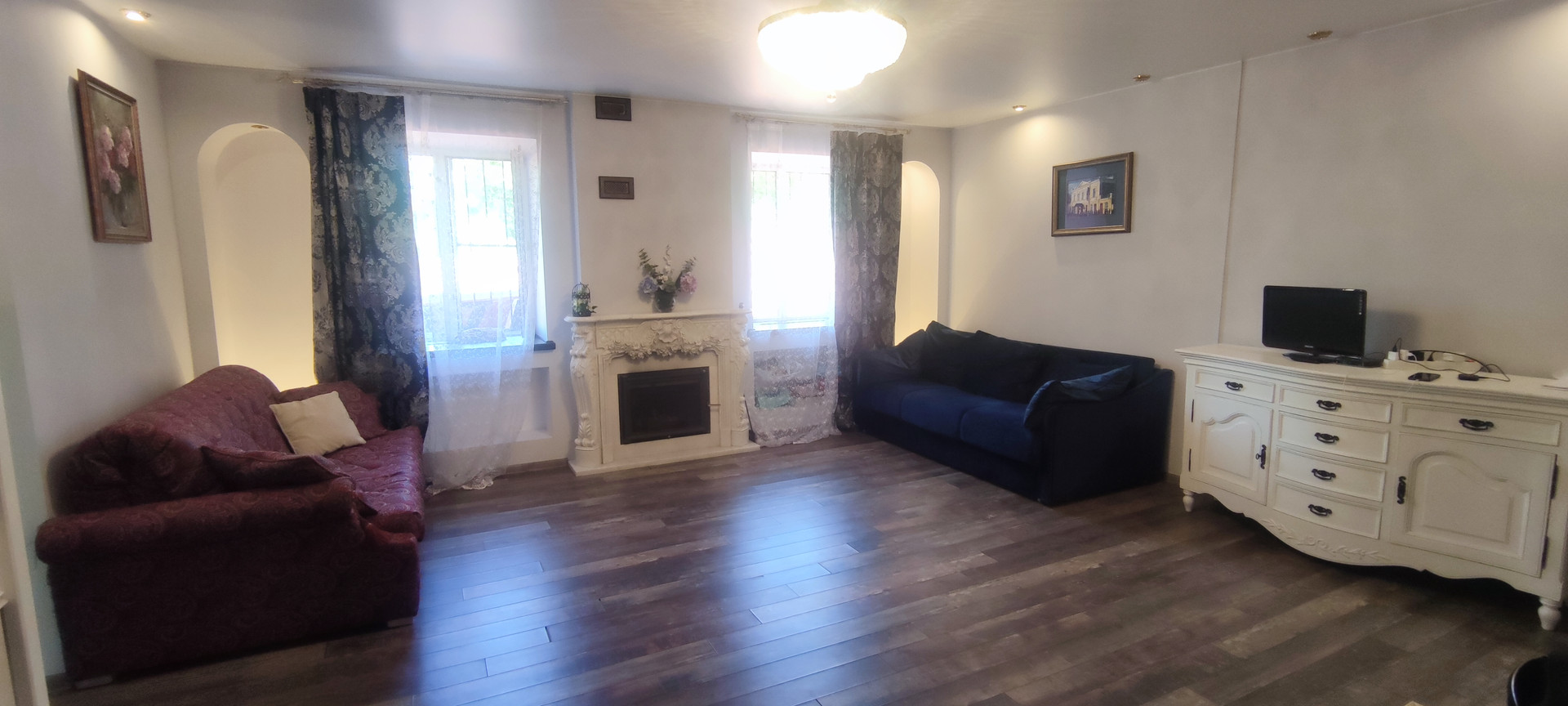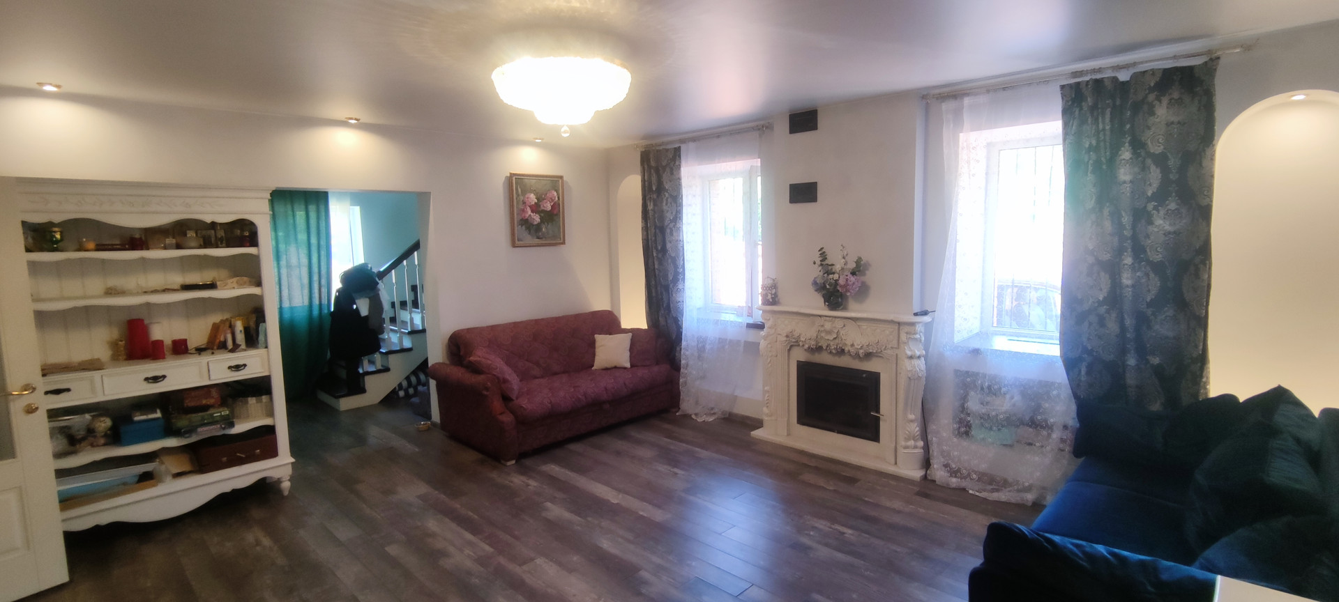 - 1-й этаж: большой тамбур со шкафами, гостиная с камином, подогреваемые пол, кухня полностью укомплектованная бытовой техникой и мебелью, с видом на фонтан, совмещенный сан-узел.