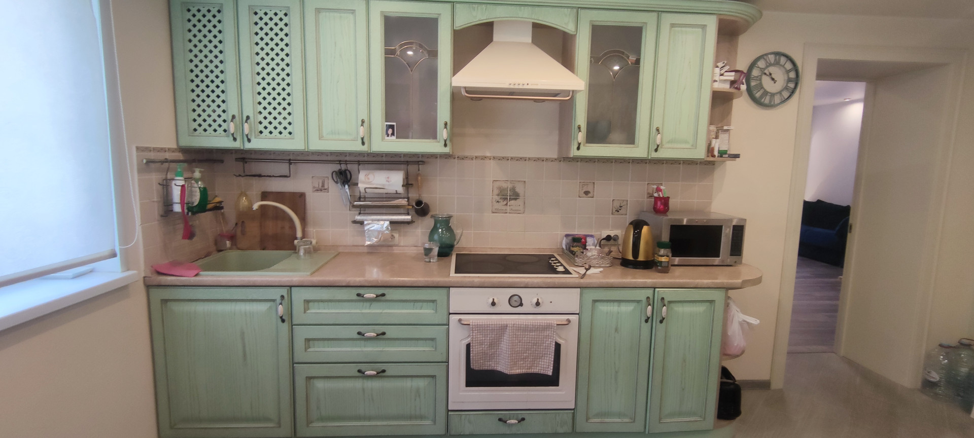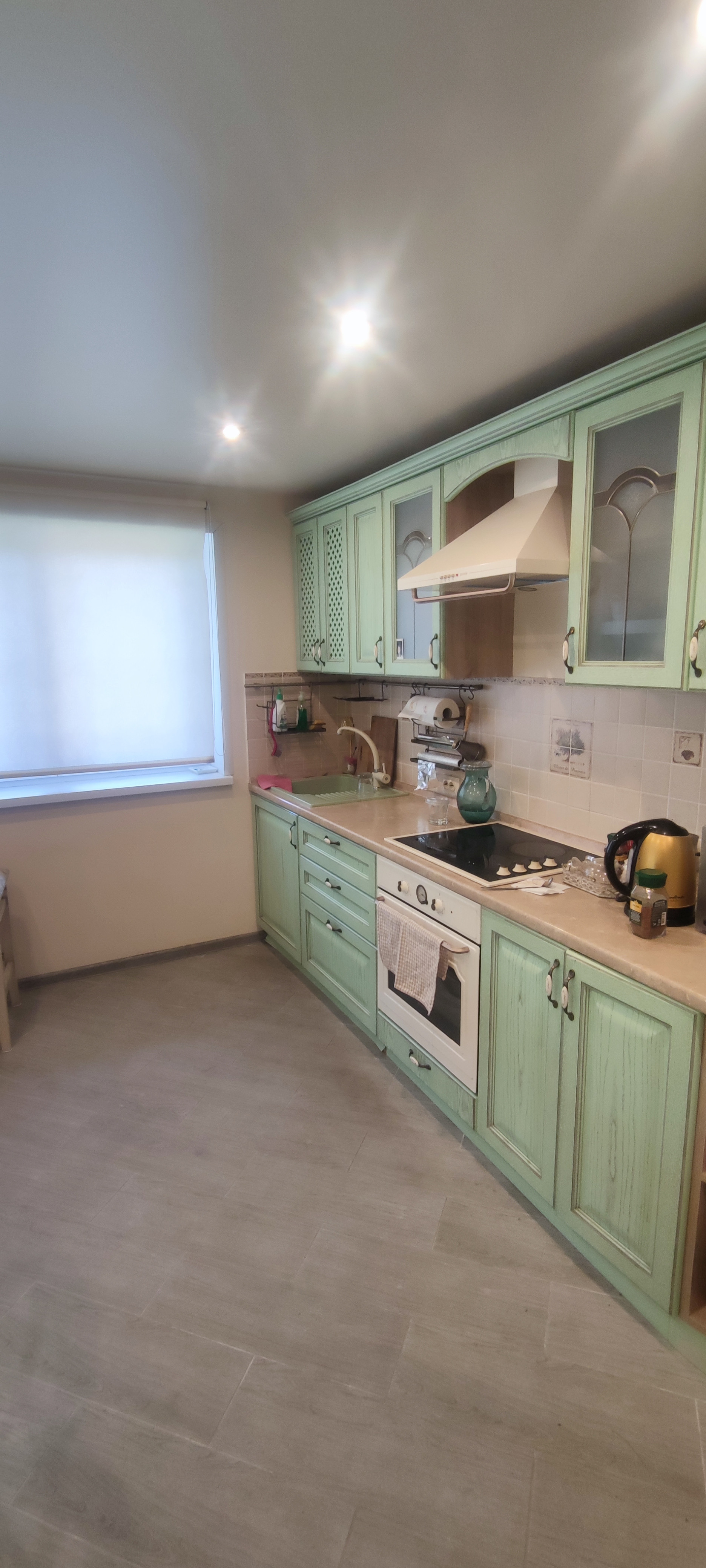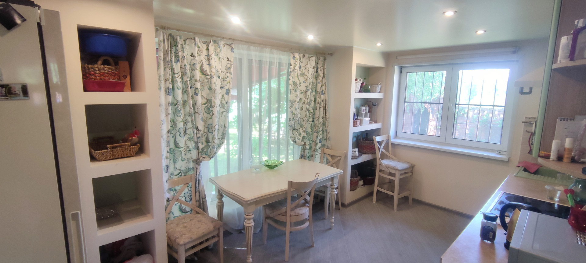 - 1-й этаж: большой тамбур со шкафами, гостиная с камином, подогреваемые пол, кухня полностью укомплектованная бытовой техникой и мебелью, с видом на фонтан, совмещенный сан-узел.