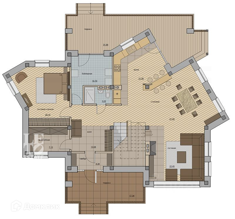 1-й этаж - прихожая, санузел, бойлерная, гардеробная, подсобное помещение, гостевая спальня, кухня-гостиная с выходом на тёплую веранду.