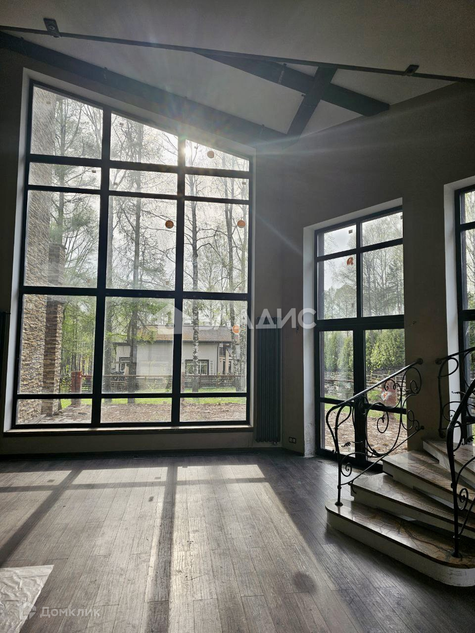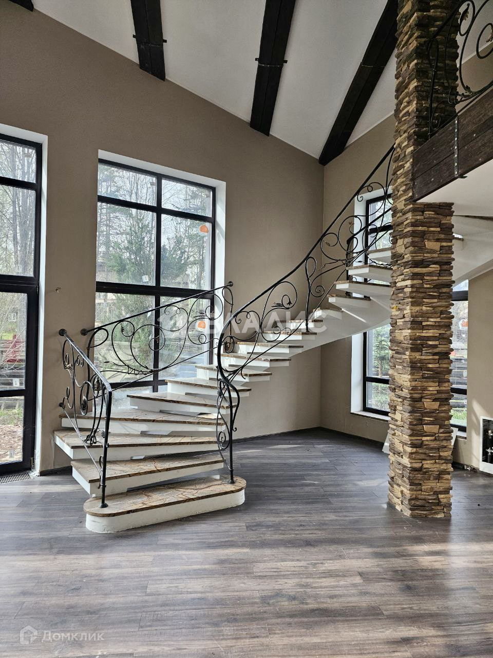 1-й этаж: прихожая, бойлерная, хозяйственное помещение, кухня-гостиная со вторым светом, камином и выходом на открытую террасу. Второй свет и мраморная лестница с кованными перилами.