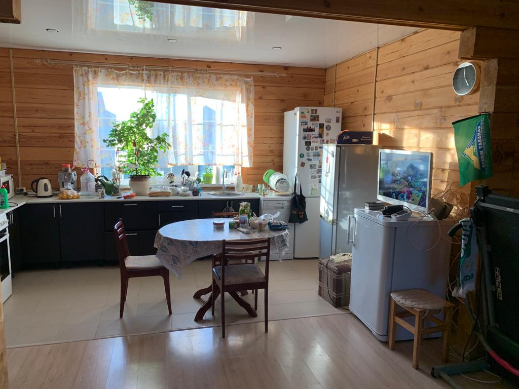 Брус 200 на 200, собран на шпунтах с и скреплен винтами. Швы промазаны специальным органическим полимером. Первый этаж полностью теплый водяной пол. Очень экономно.