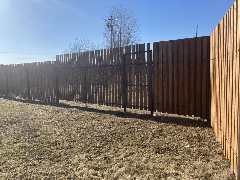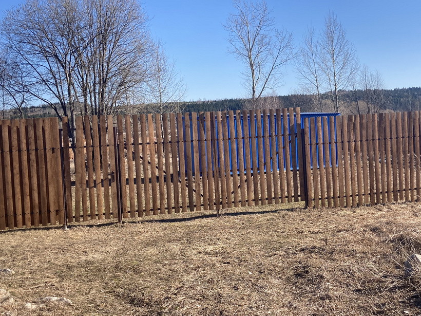 По периметру забор с калиткой и воротами, установлен 2022 году, вдоль дороги не прозрачен, продублирован штакетником. Перед участком имеется площадка для парковки гостевых машин.