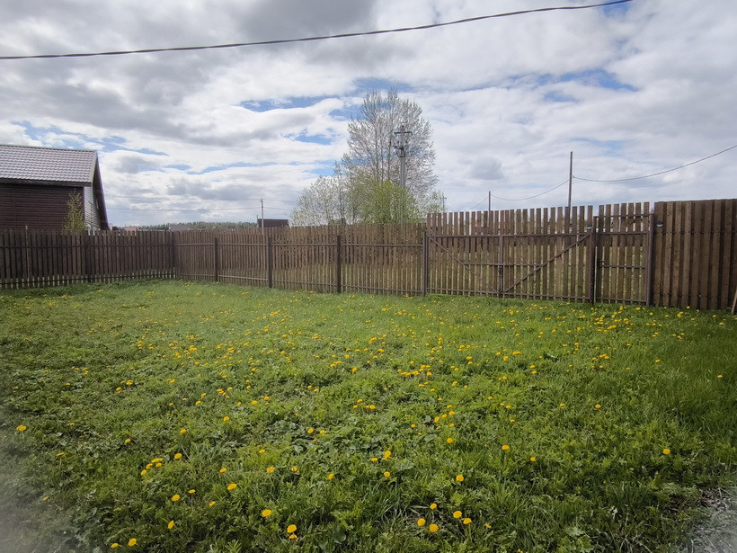 По периметру забор с калиткой и воротами, установлен 2022 году, вдоль дороги не прозрачен, продублирован штакетником. Перед участком имеется площадка для парковки гостевых машин.