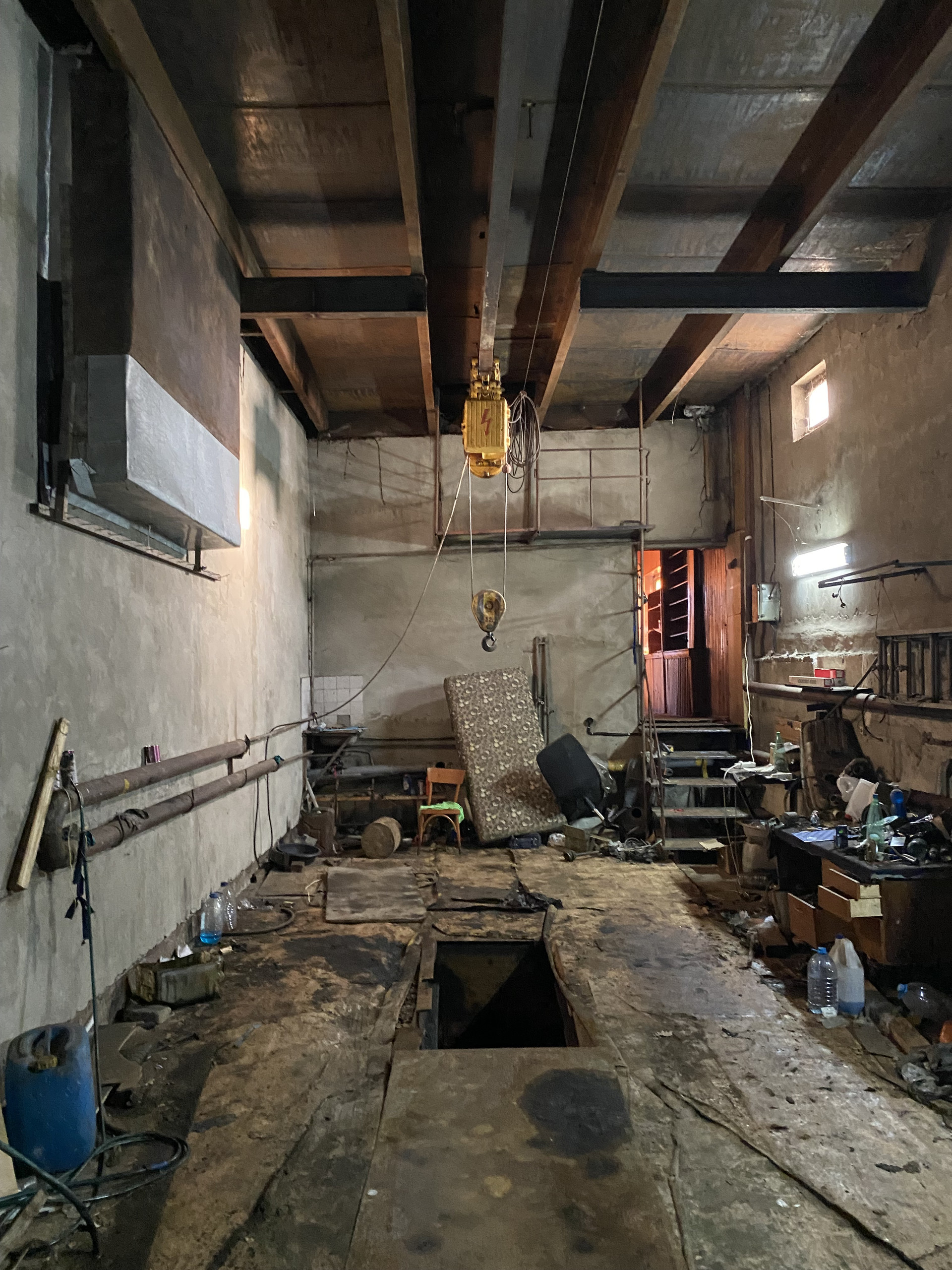Ранее использовался как автосервис для грузовых авто. В доме есть лифт на 1000 кг и кран балка.