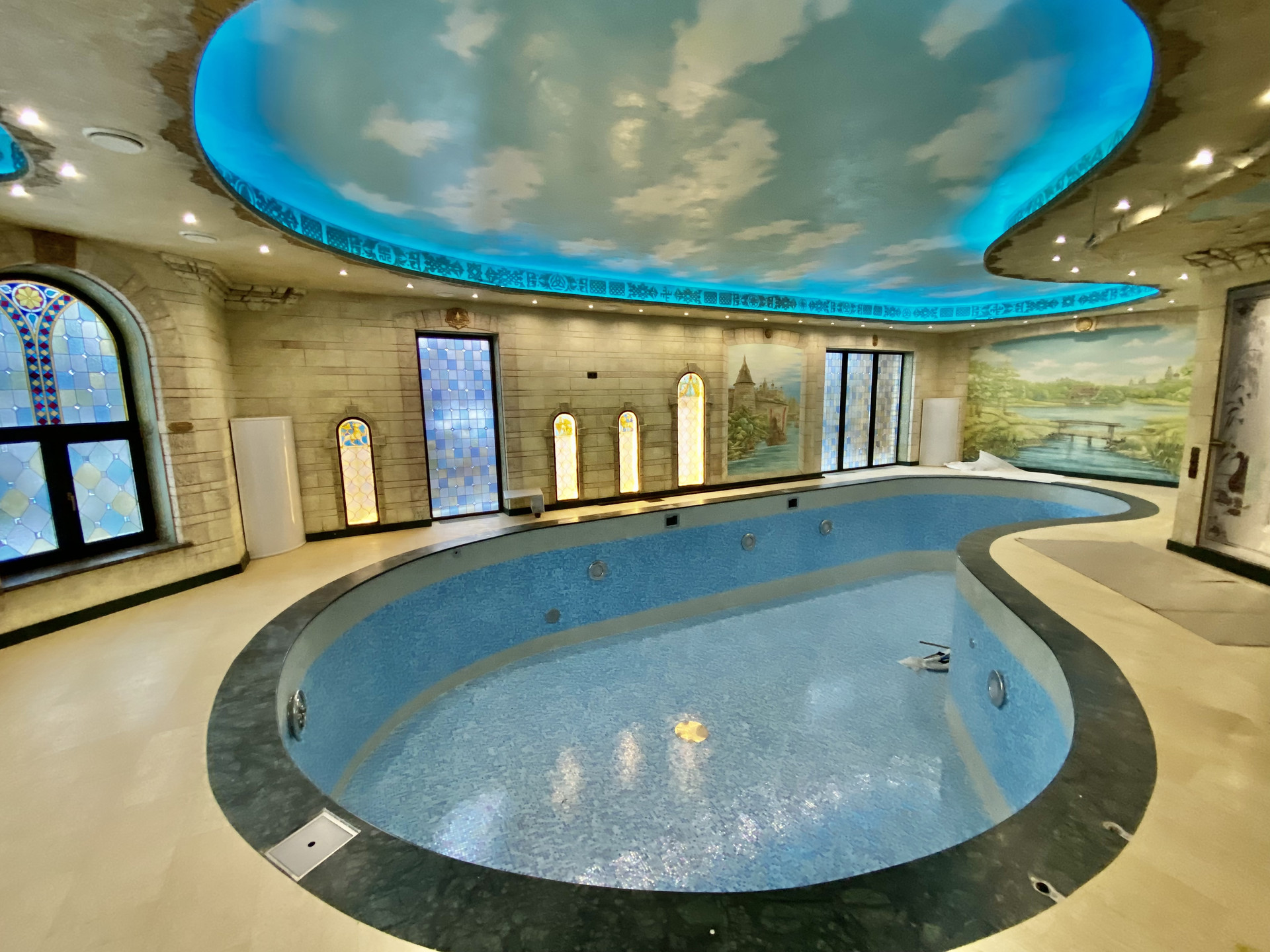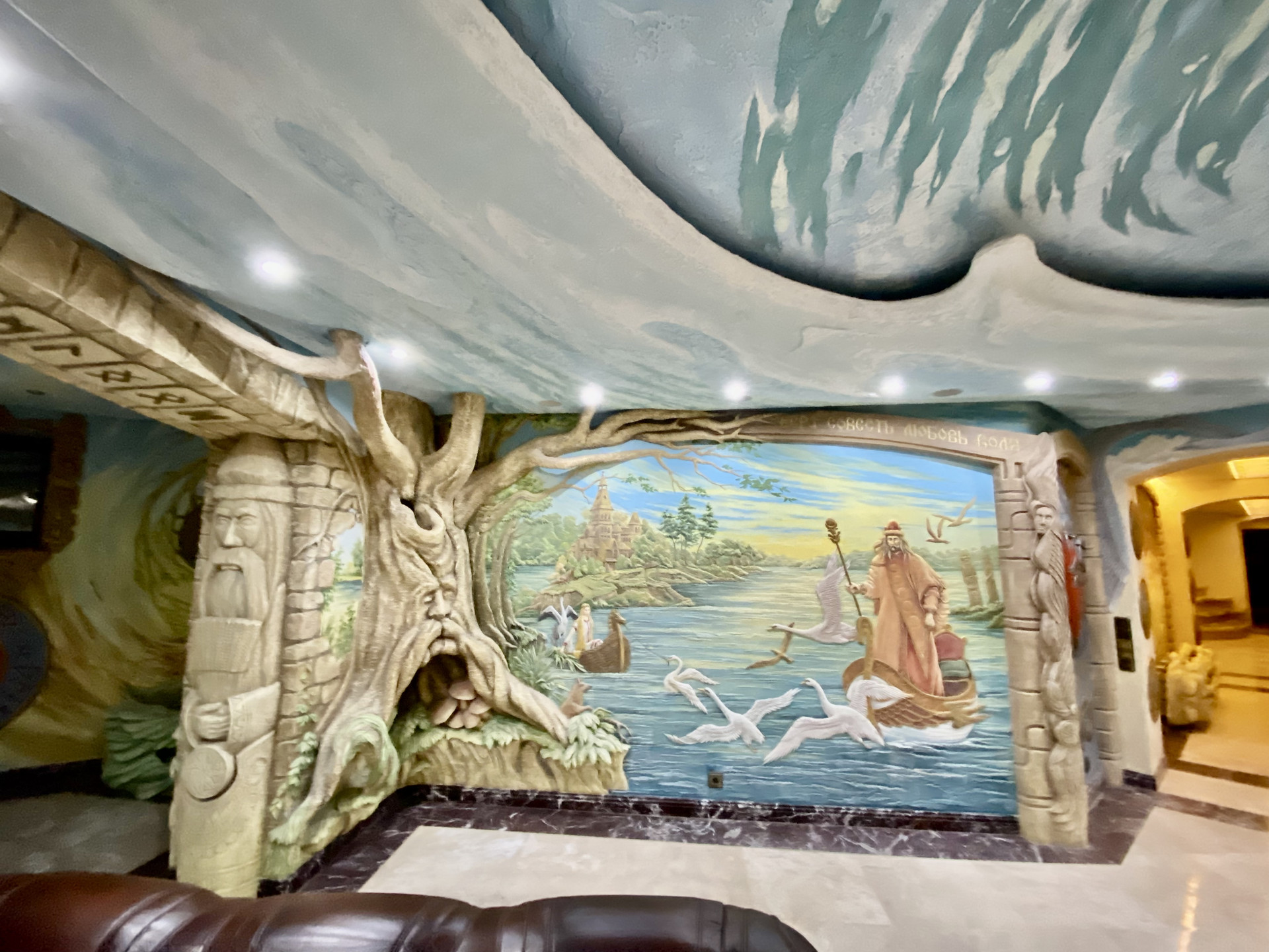 - стены и потолки украшены ручной росписью, мозайкой, фресками и лепниной на мифологические темы.