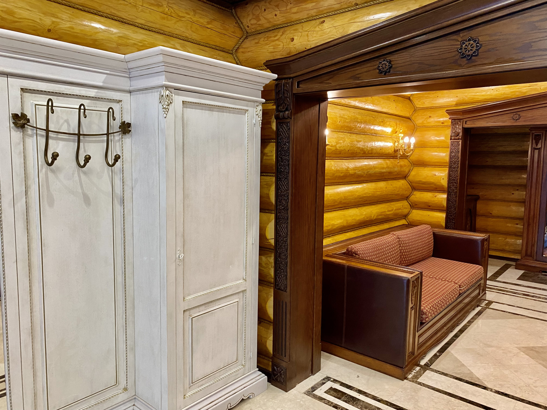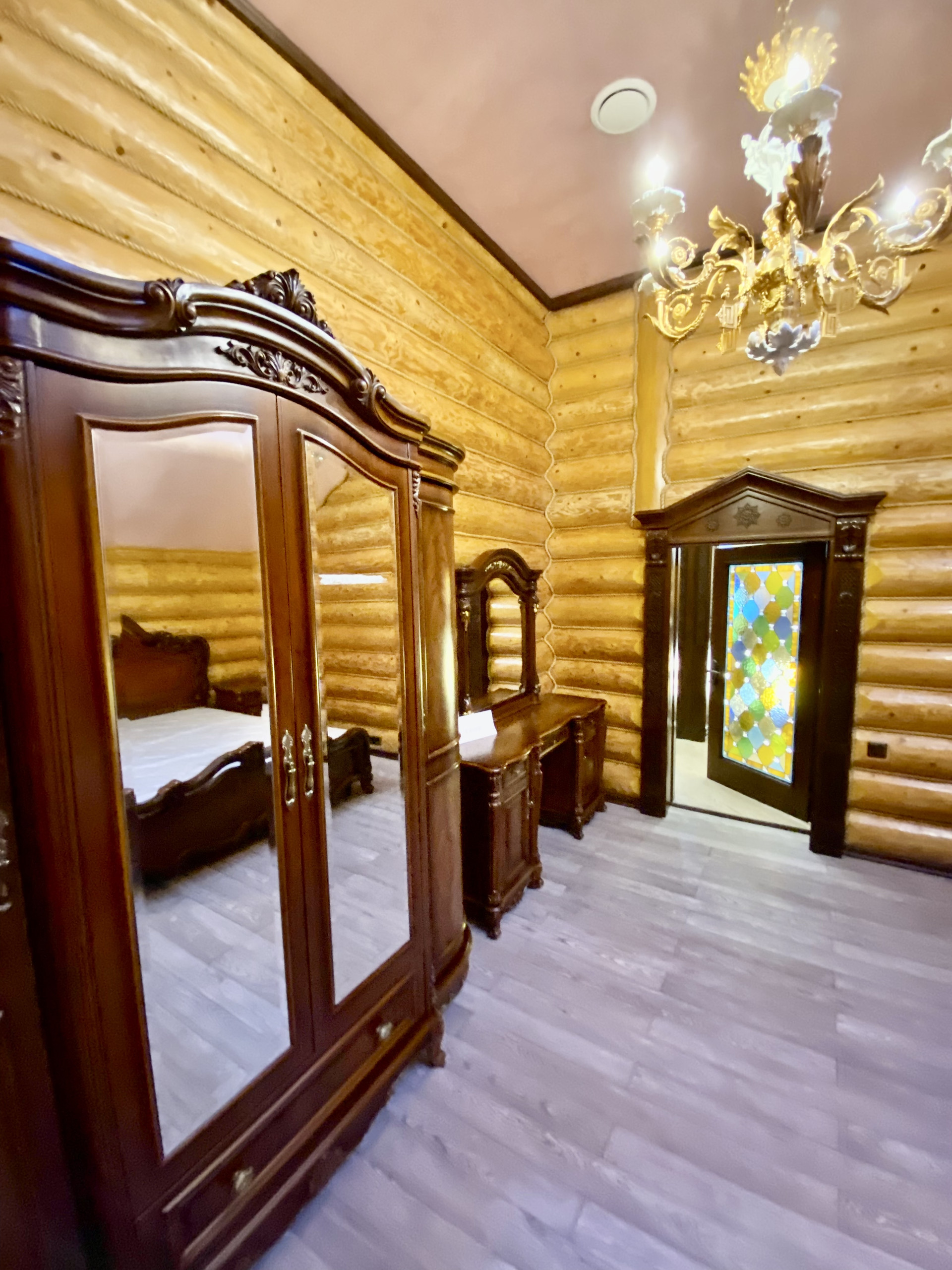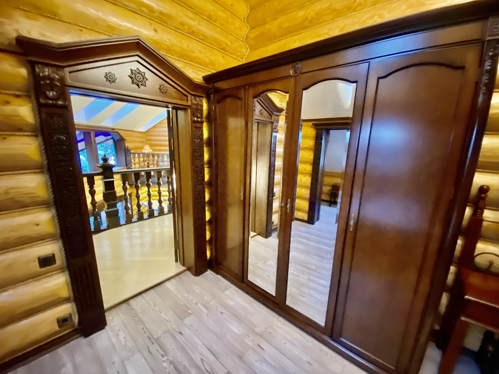 - дверные проёмы и ниши оформлены стилизованными колоннами и арками с резьбой по дереву ручной работы.