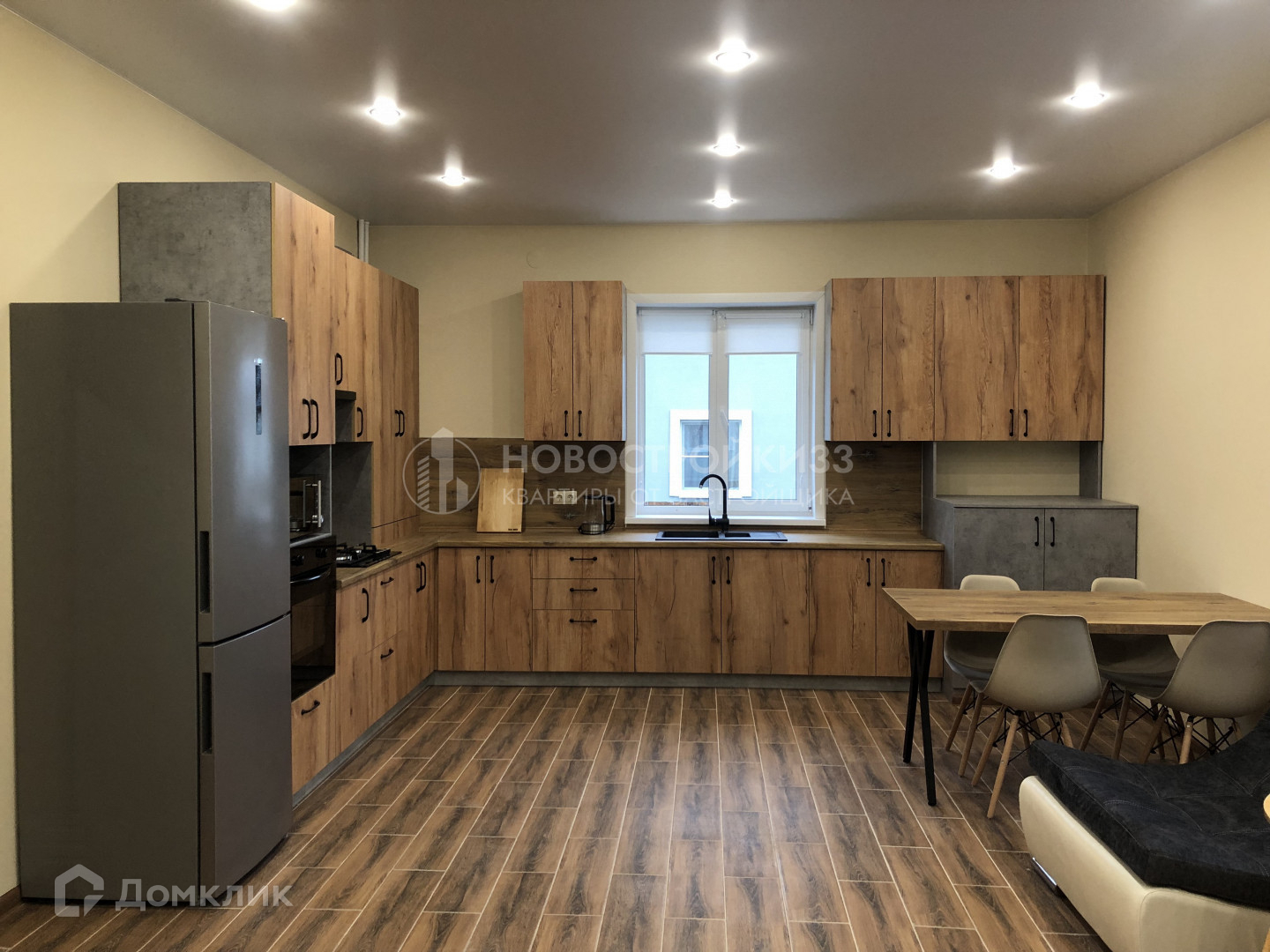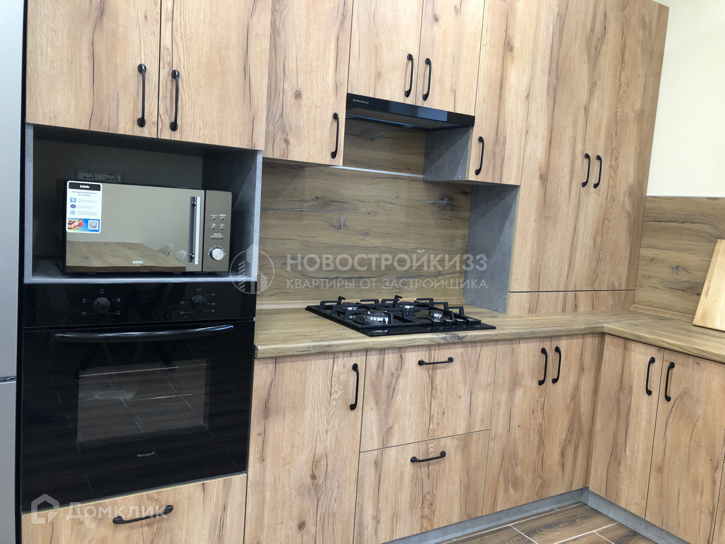 Дом с современной мебелью и техникой (духовой шкаф, варочная поверхность, микроволновая печь, холодильник, ТВ, чайник, стиральная машина).