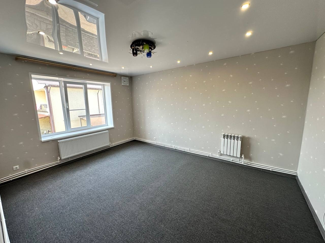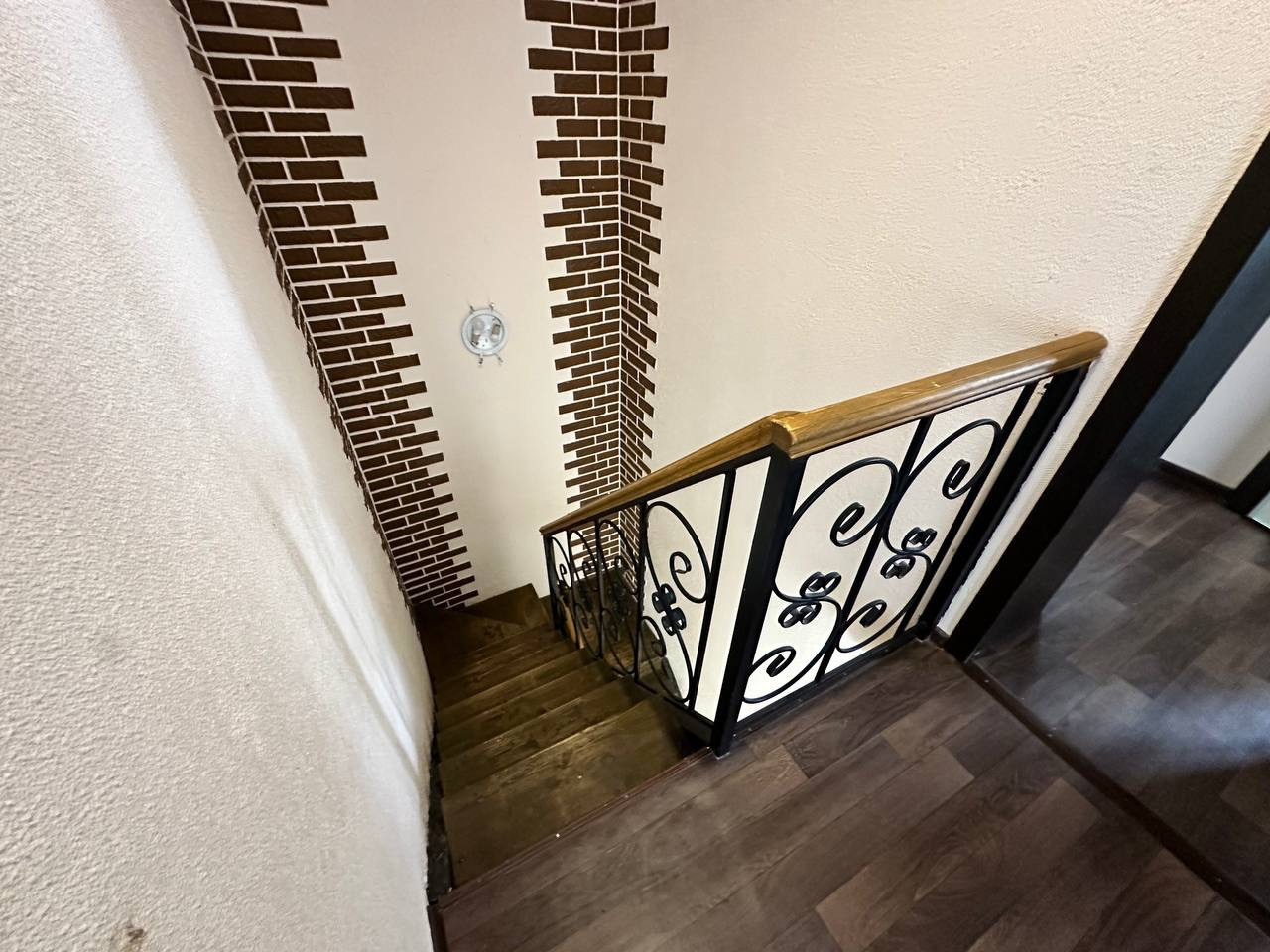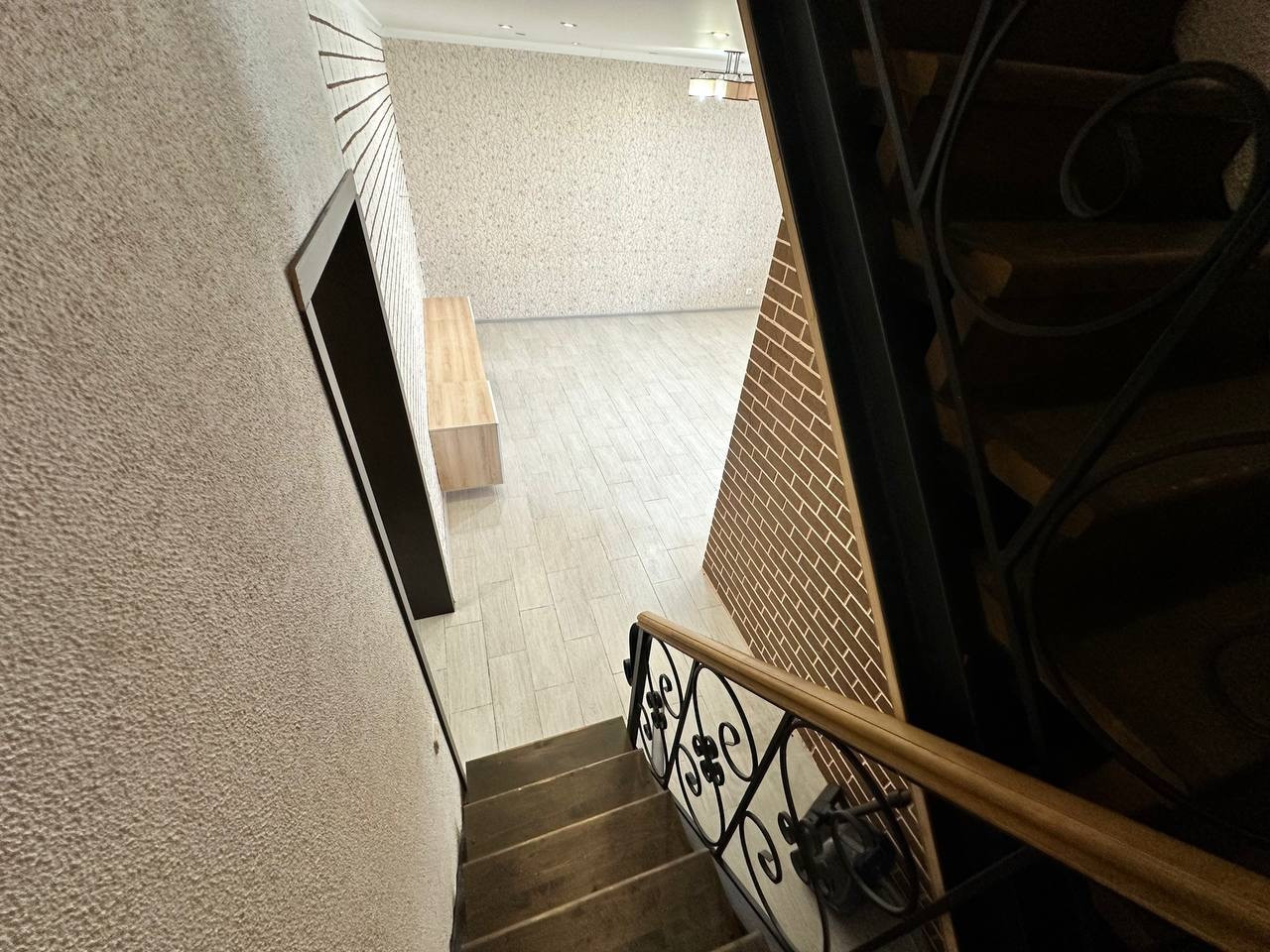 В квартире сделан качественный ремонт. На полу на первом этаже керамогранит, натяжные потолки, на стенах обои и декоративная штукатурка.
