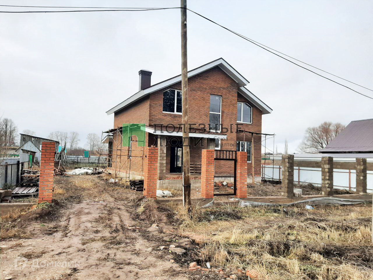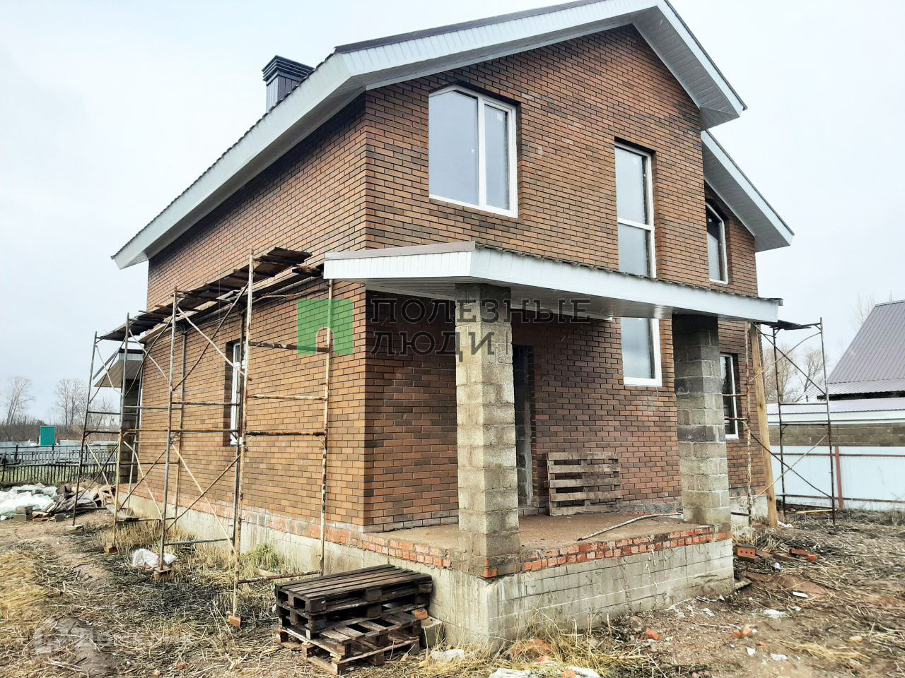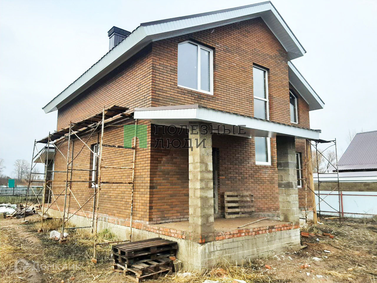 Дом из кирпича , без внутренней отделки, есть входная дверь , двухкамерный стеклопакет , лестница на второй этаж, комнаты разделены, передний забор.