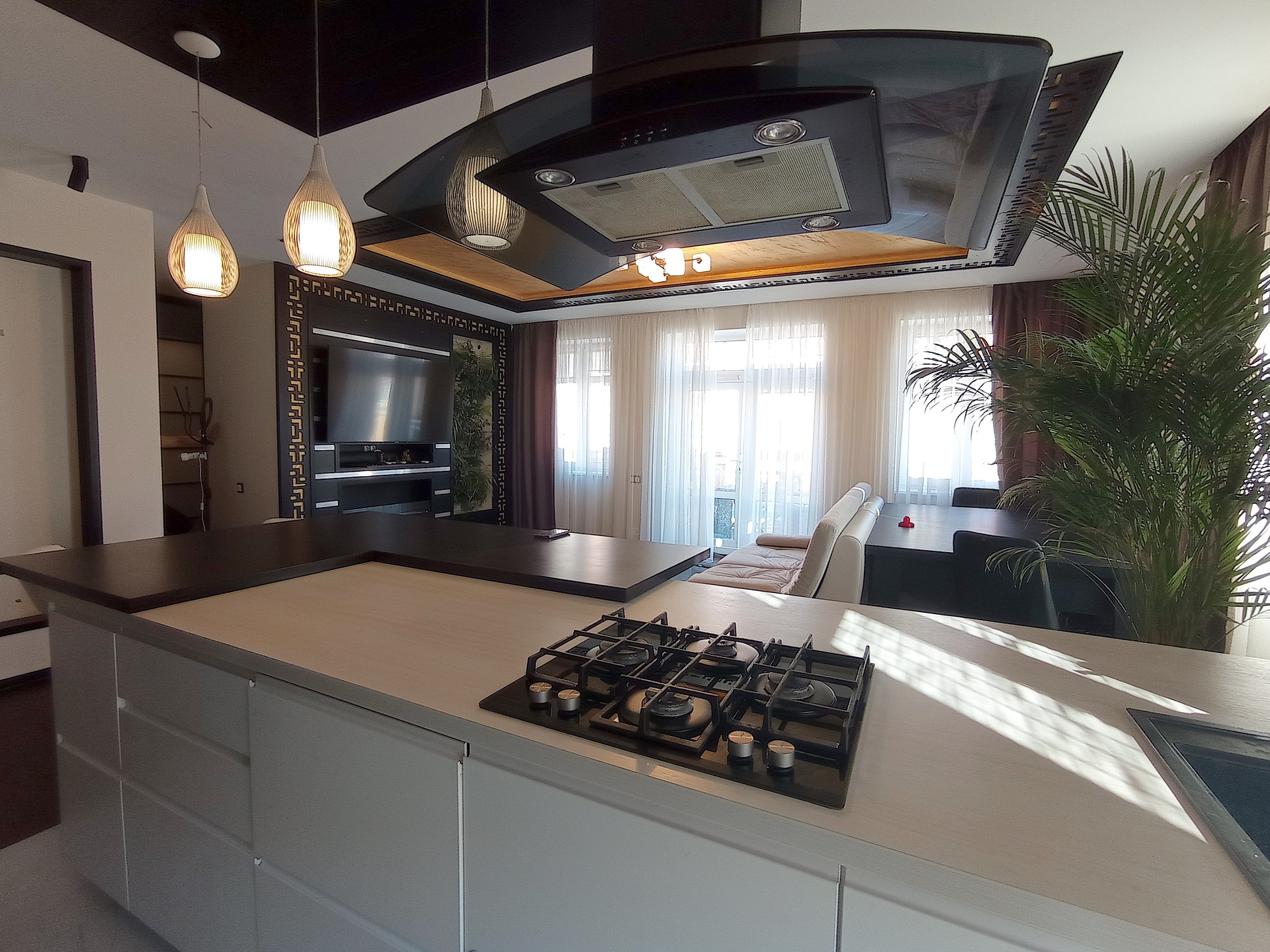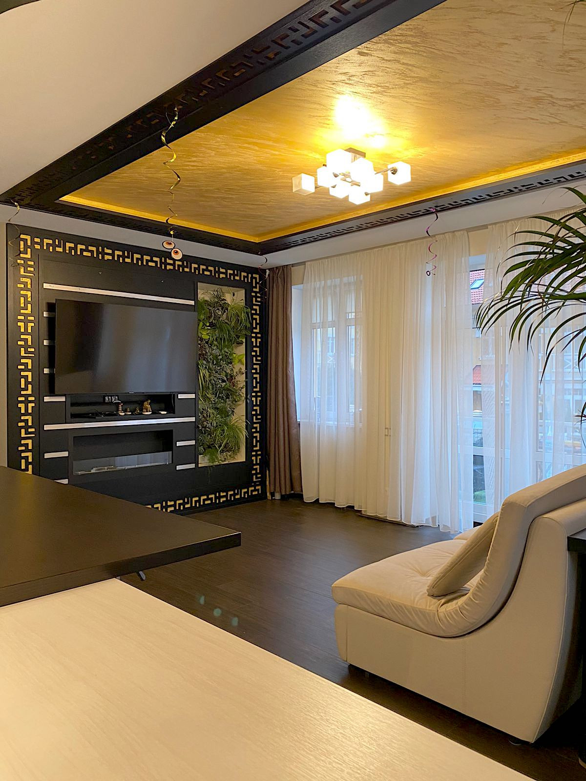 - просторная гостиная (с большим диваном, телевизором, био-камином);
