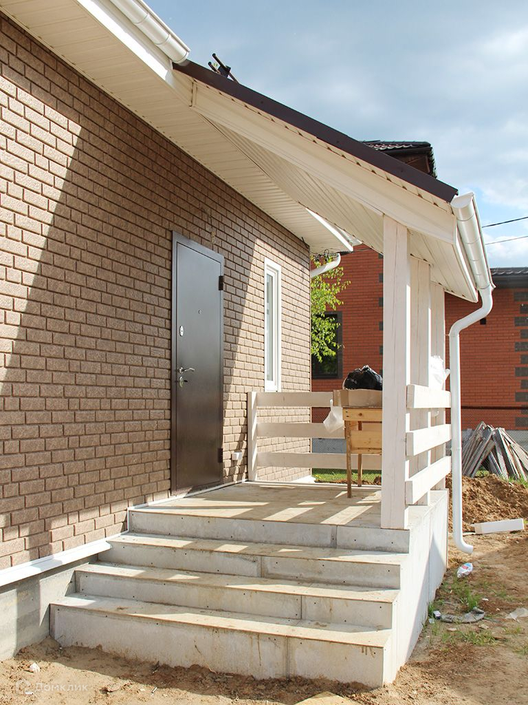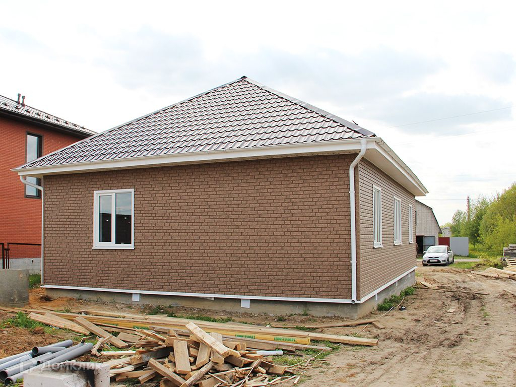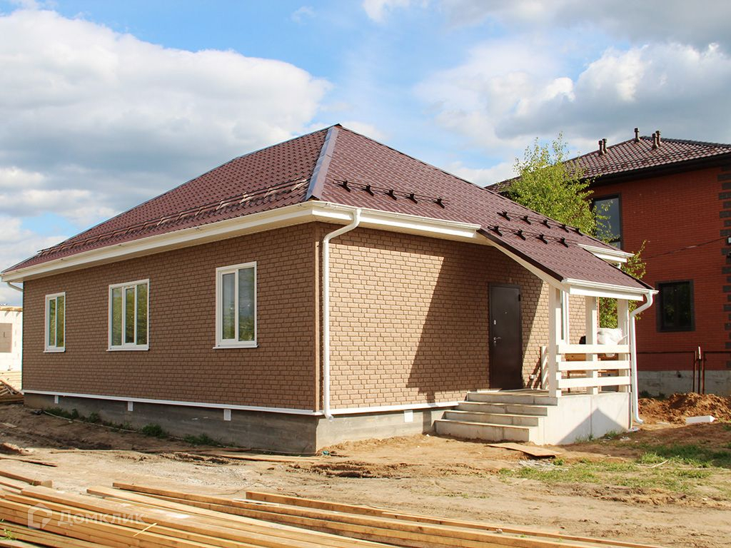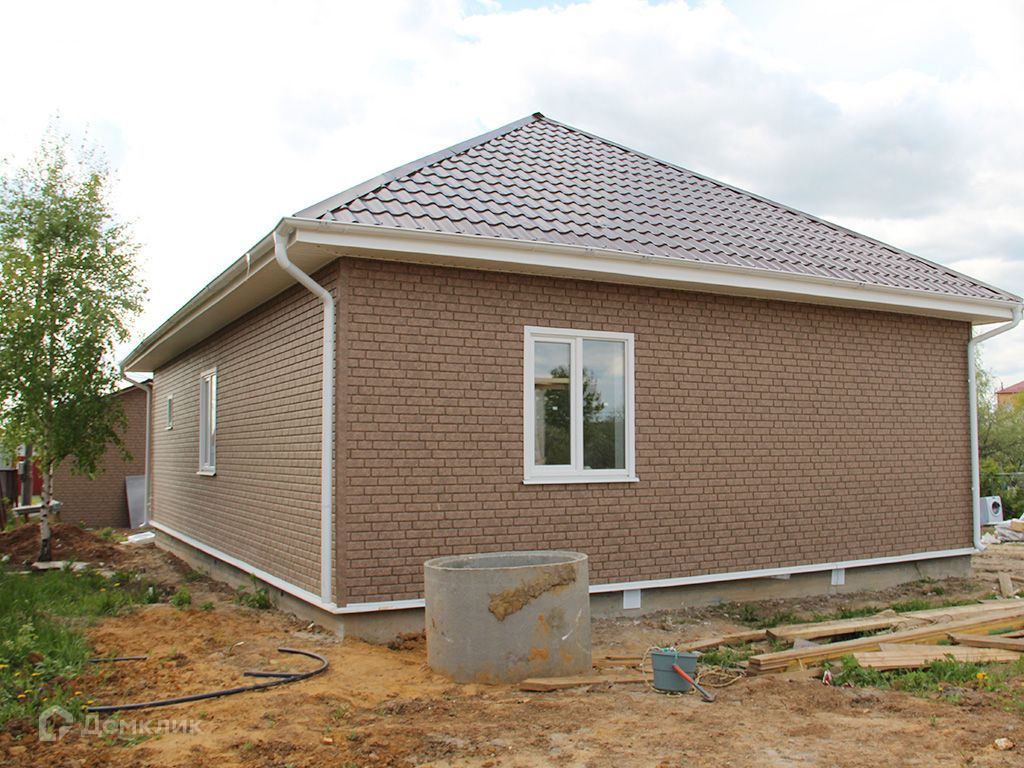 Построен в одном уровне из блоков, снаружи обшит сайдингом "под кирпич".Окна стеклопакеты, крыша металлочерепица. На полу ламинат, линолеум.Дом полностью отделан, установлена сантехника.Удобная планировка: прихожая, просторная кухня-гостиная, 3 спальни, санузел, бойлерная.Коммуникации: электричество 380 В (15кВт), водоснабжение - колодец, канализация - септик. Магистральный газ - по границе участка.