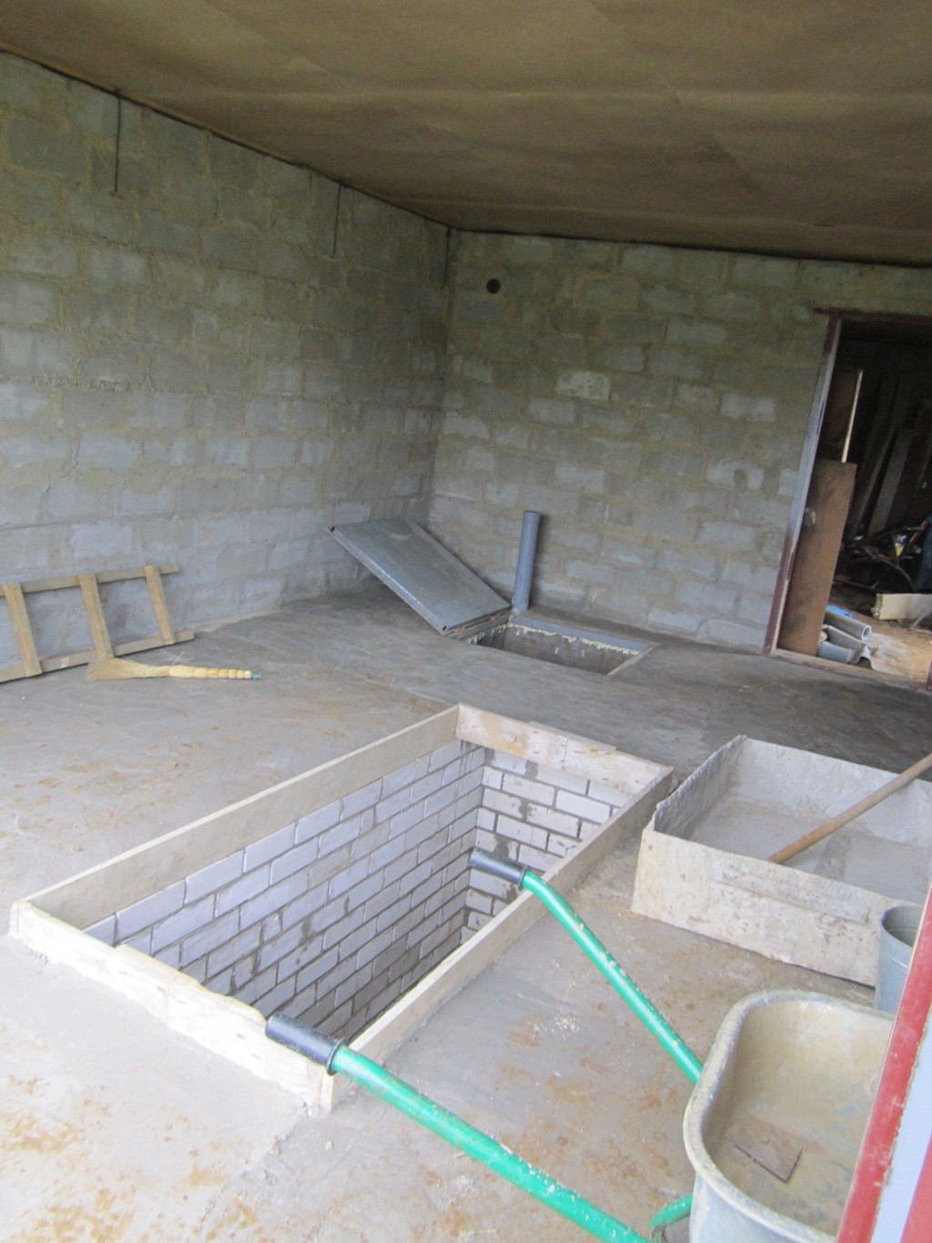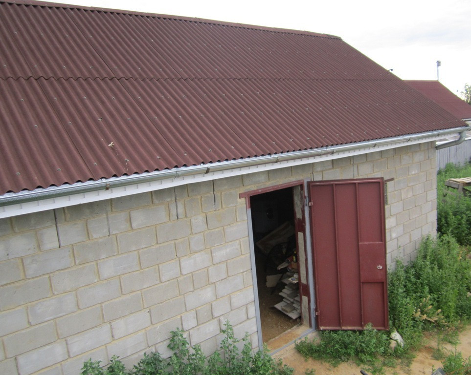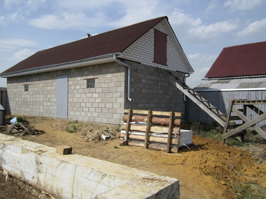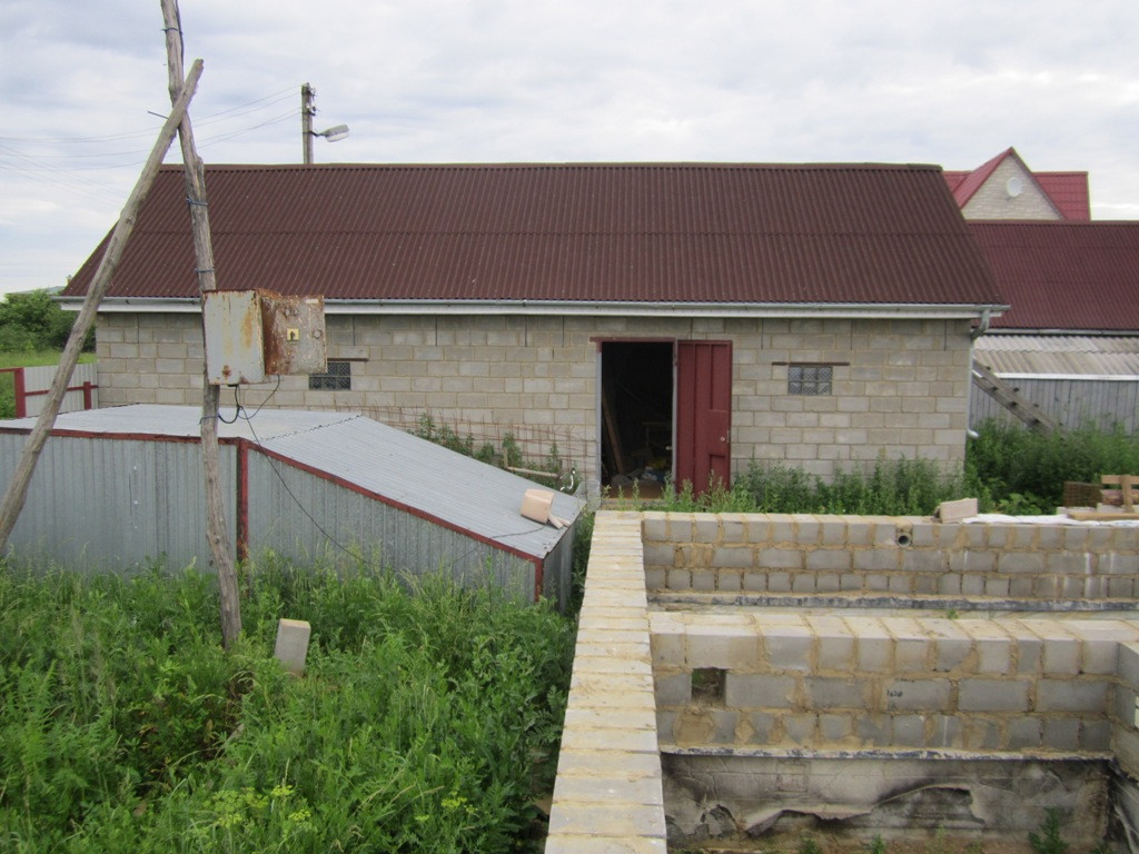 2. гараж и хозпостройка из блоков под одной крышей из металлочерепицы, на фундаменте, смотровая яма, подвал