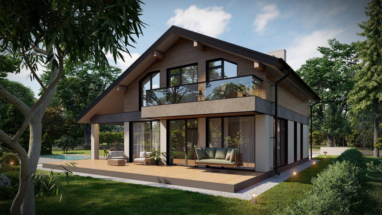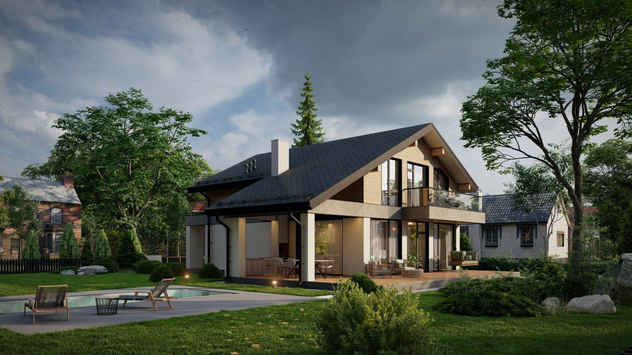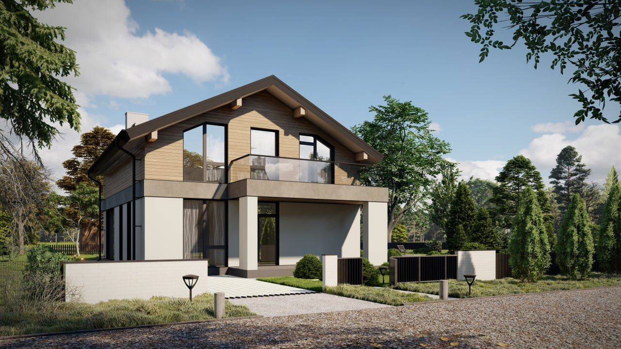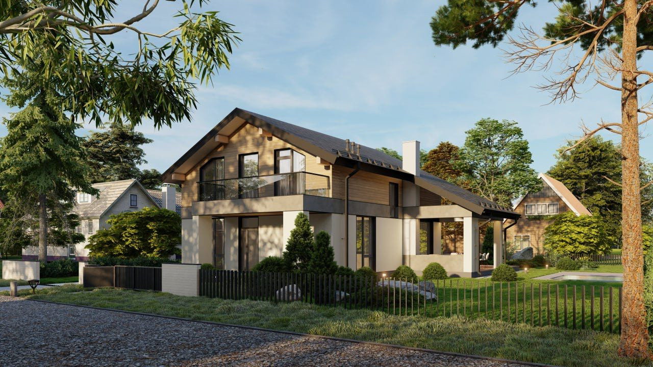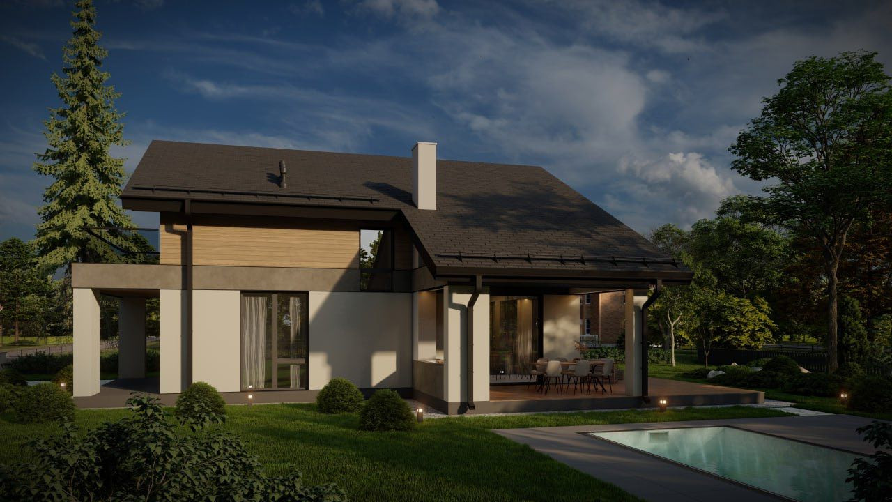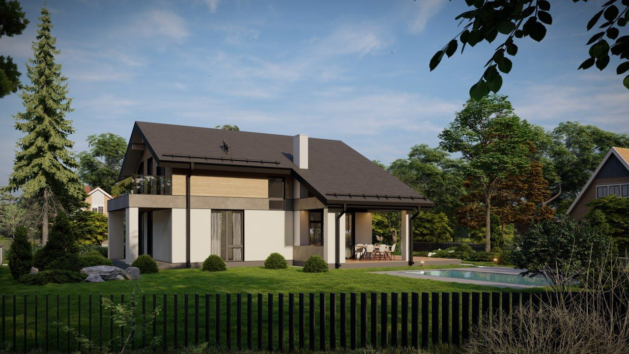 В проекте предусмотрено пять спален, четыре из них расположены на втором этаже. Эта территория отдыха, территория семьи и приватности, а для приема гостей можно задействовать гостевую спальню, расположенную на первом этаже.Там же, на первом уровне дома находятся кухня-столовая и гостинная (площадью в 40 кв.м) с выходом на открытую террасу (46,6 кв.м.). Для удобства семьи, проект предусматривает 3 санузла (один на первом этаже дома и два на втором). Приятным бонусом для любой хозяйки будет персональная гардеробная комната.