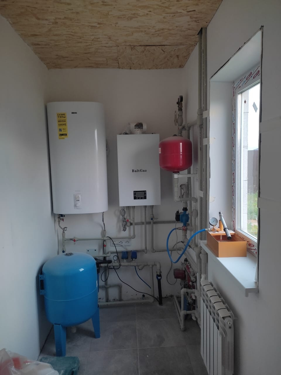 Договор на подведение газа заключён и часть оплачена (32 тыс. остается доплатить после выполнения работ), по договору пуск газа не позднее 31.12.23г, но трубы прокладывать по улице уже сейчас. Установлен двухоконтурный газовый котёл на 18кВт. Сейчас основным подключён электрический котёл, который после подключения газа останется резервным, по дому разведены радиаторы. На первом этаже дополнительно сделана система водяных тёплых полов (Долговечные испанские трубы STOUT).
