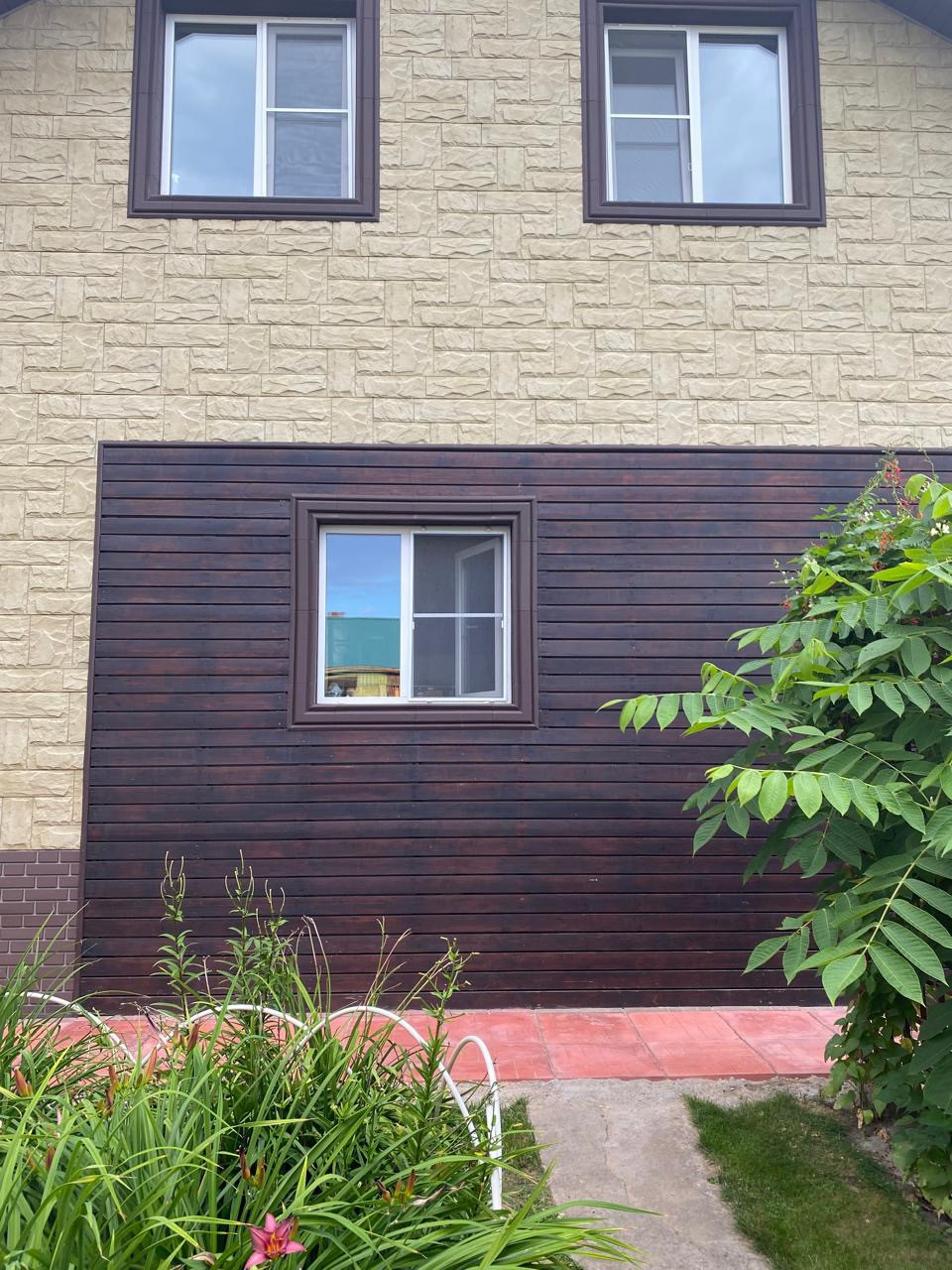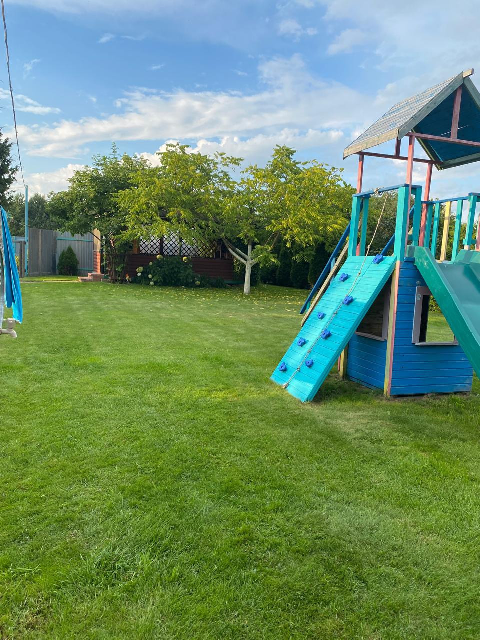 Участок ухоженный, посажен газон, хвойные и плодовые деревья, цветы.