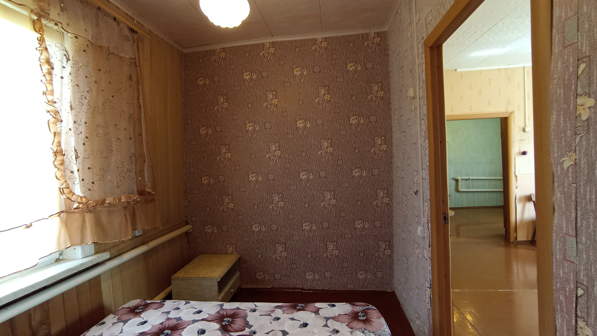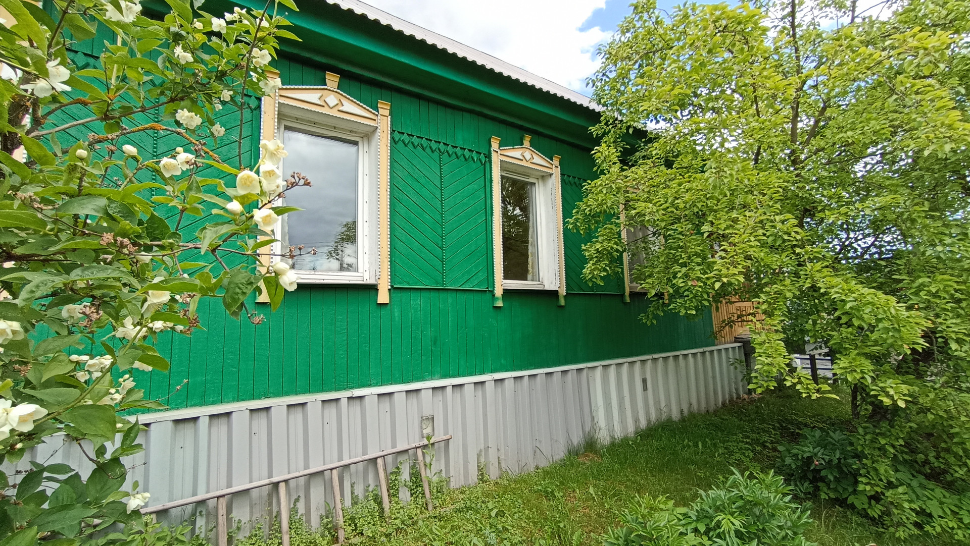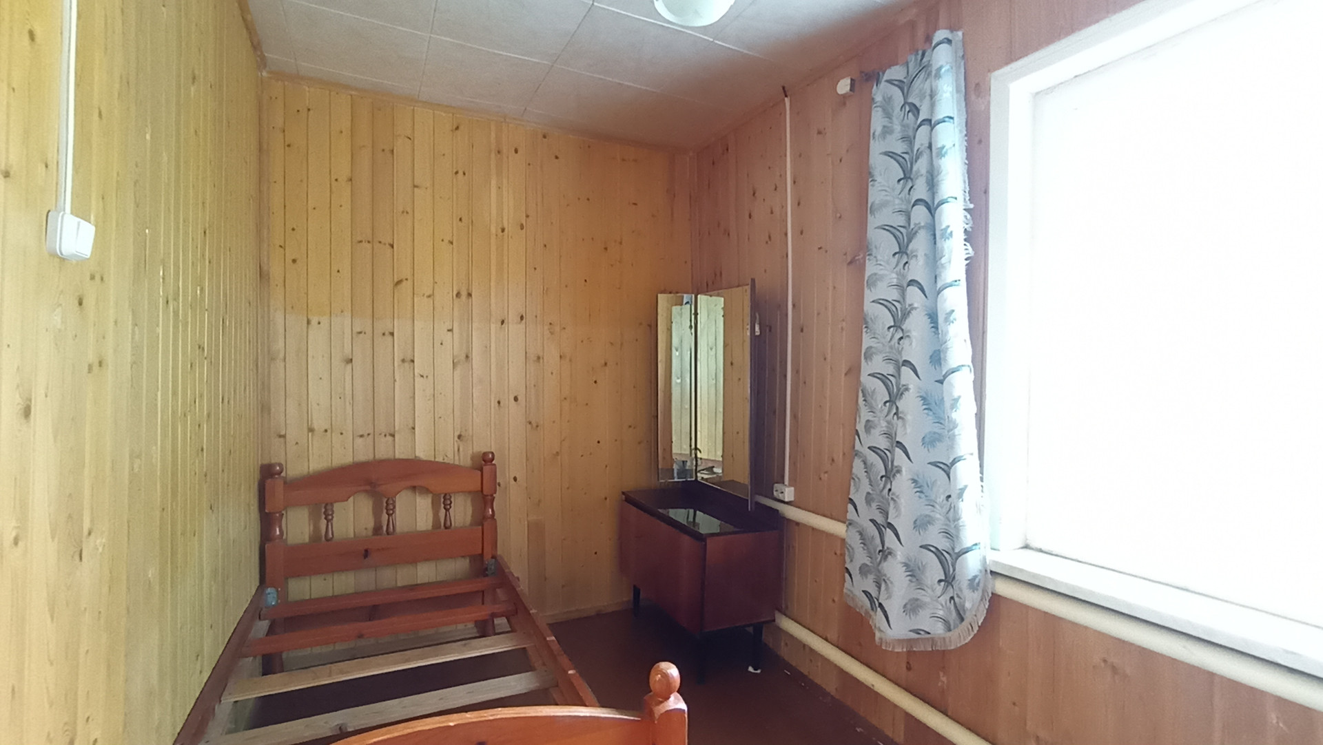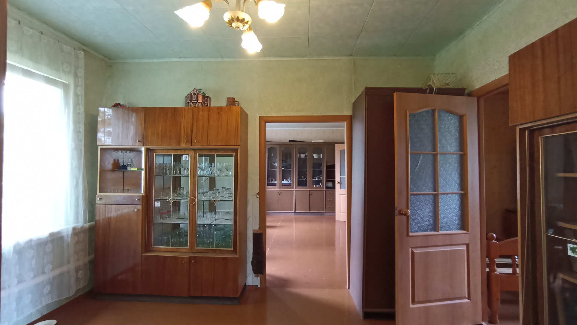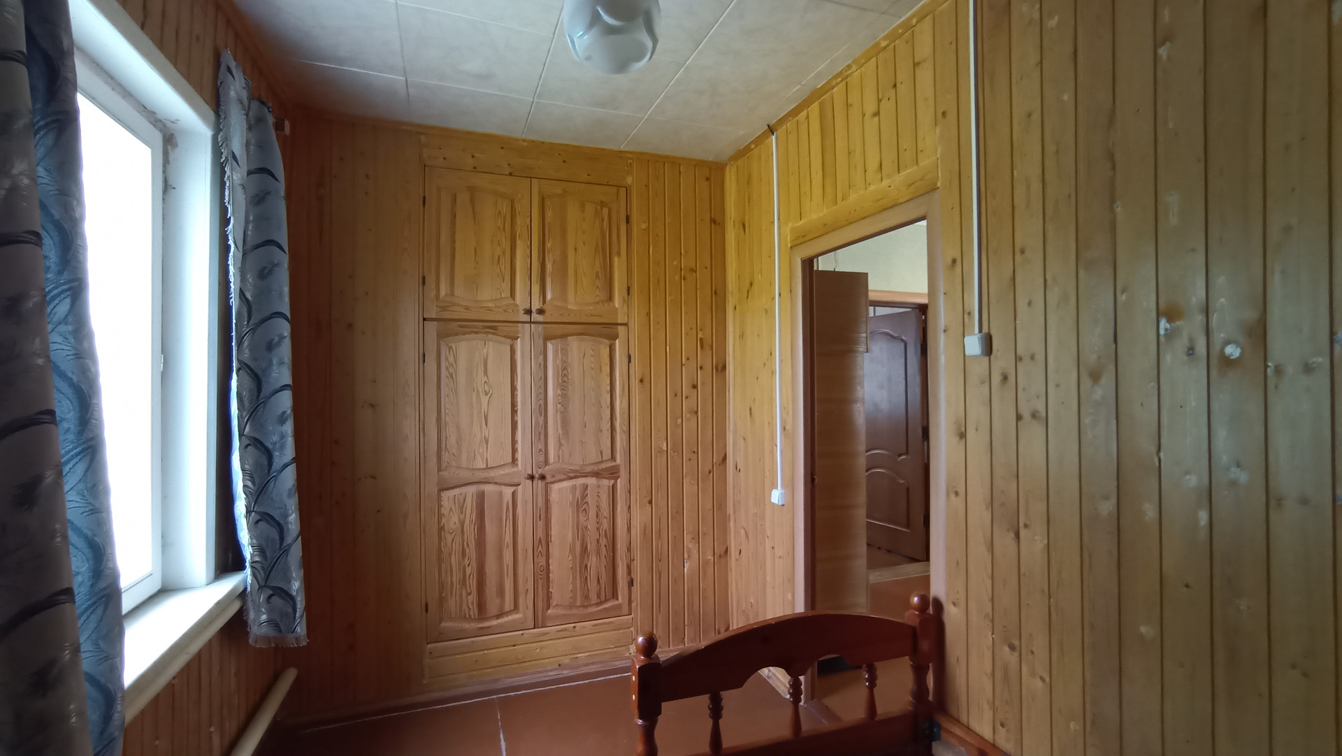 В доме с высокими потолками - терраса, гостиная, четыре комнаты, все с окнами, тёмных нет. Окна пластиковые.