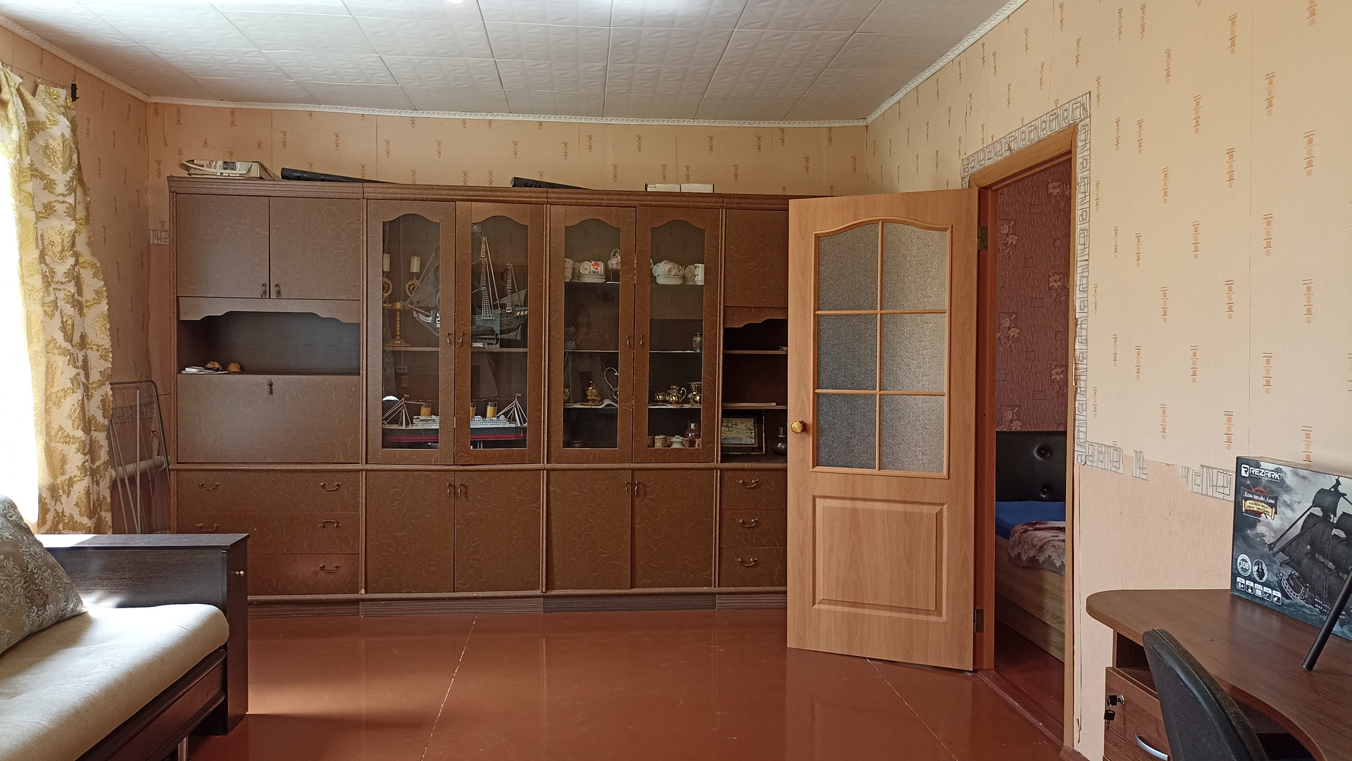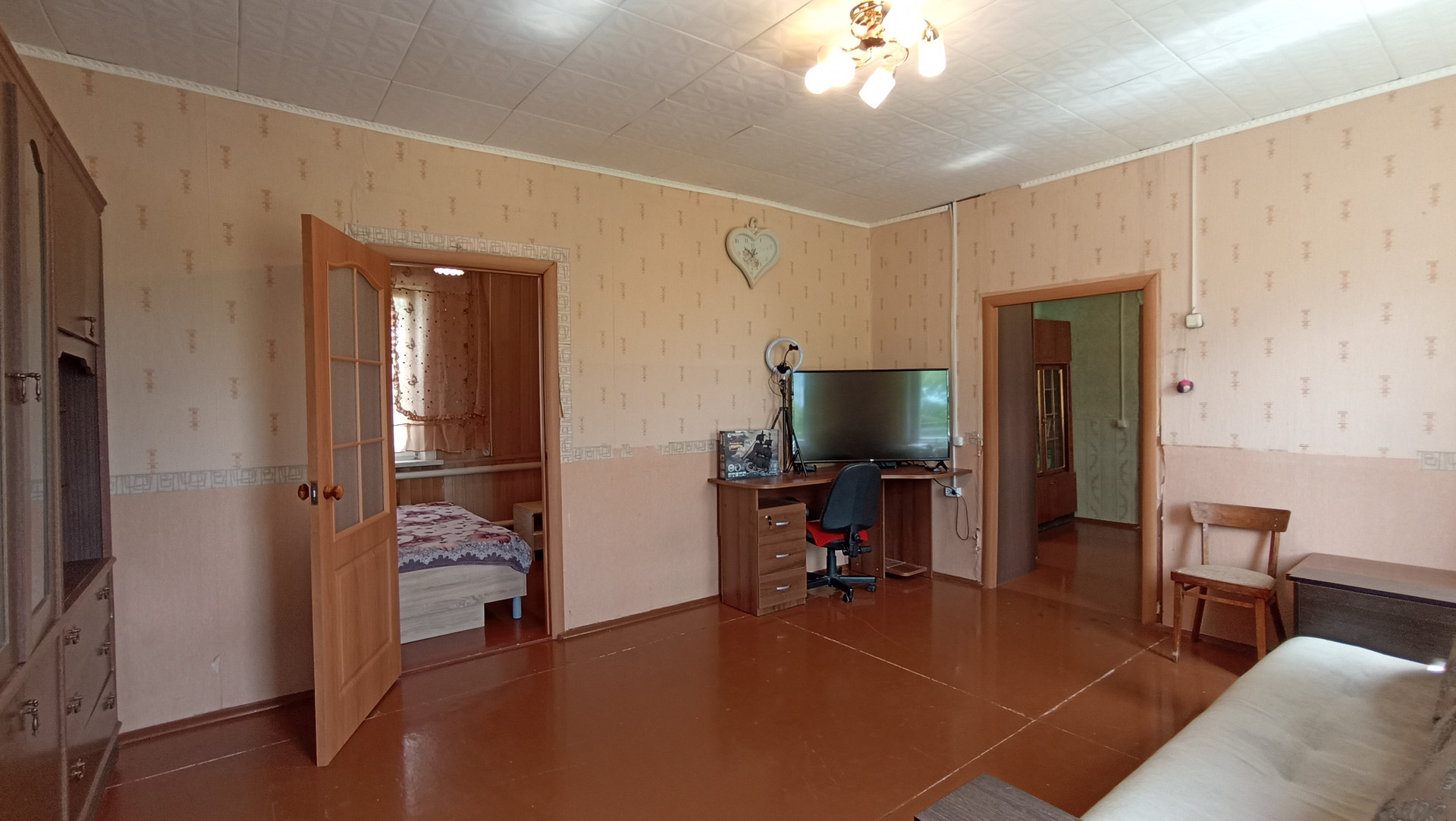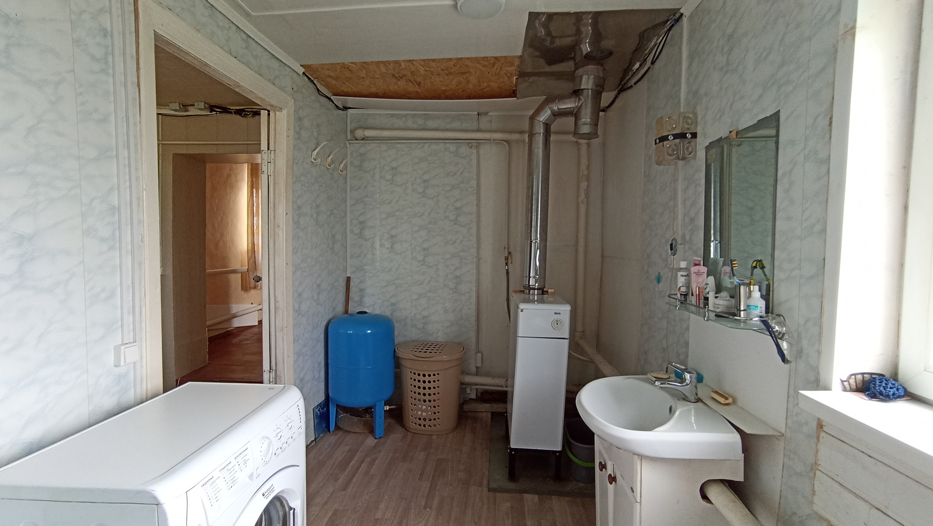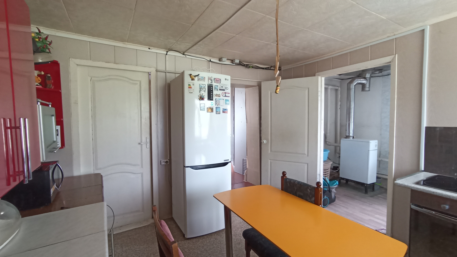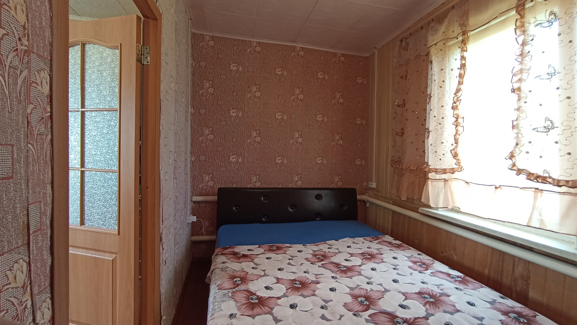 В доме с высокими потолками - терраса, гостиная, четыре комнаты, все с окнами, тёмных нет. Окна пластиковые.