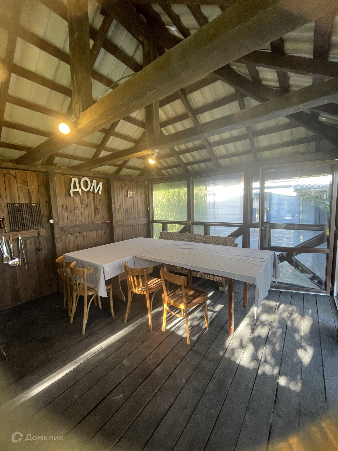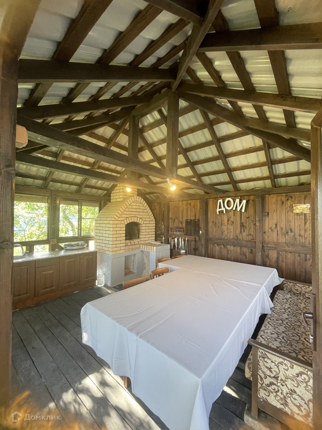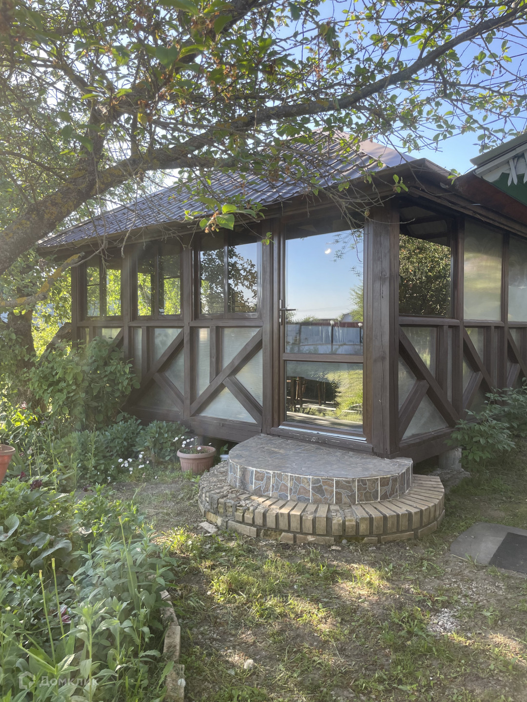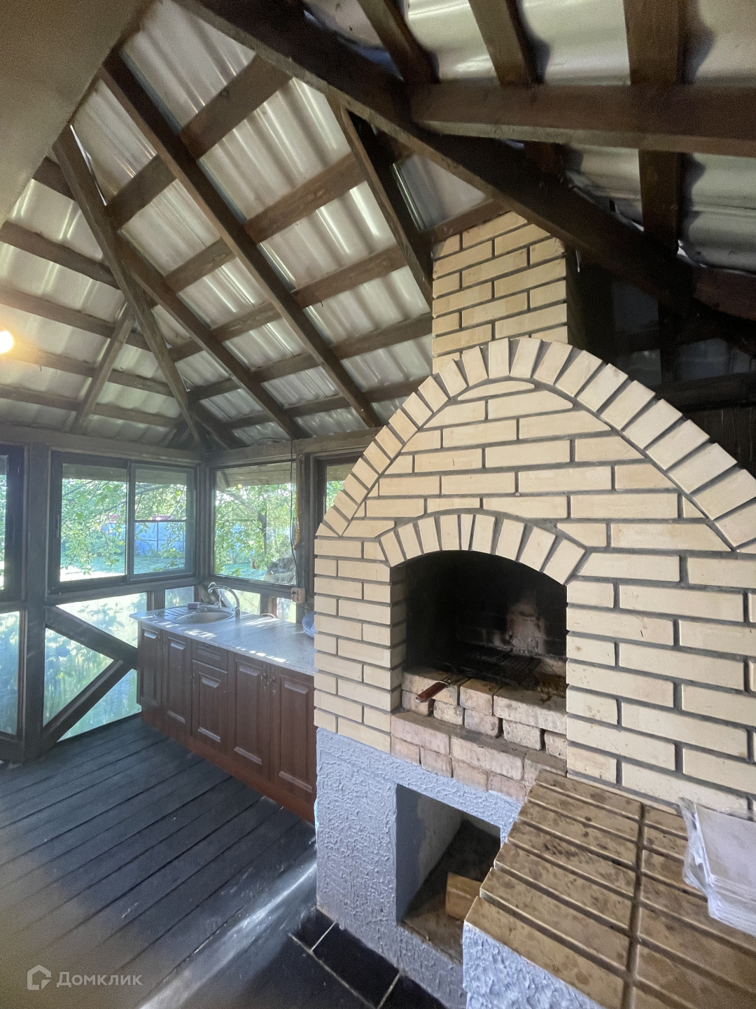 На участке расположена добротная беседка с остеклением и камином. Имеется встроенная  кухня.