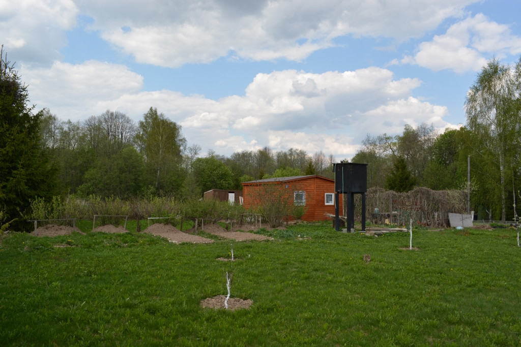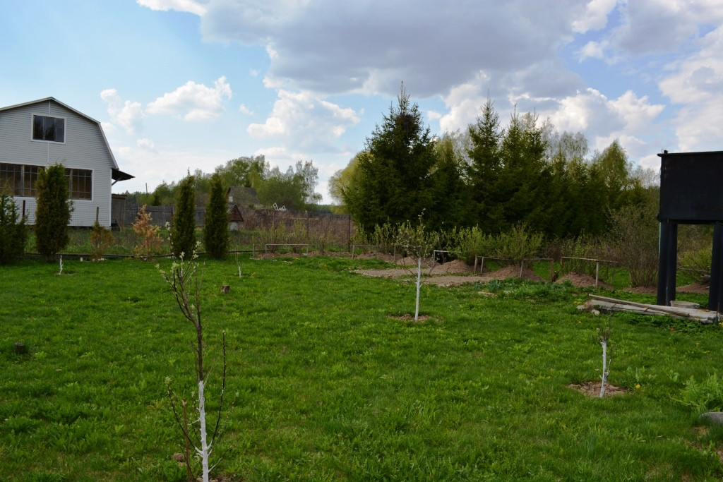 Частично огорожен, ровный, без перепадов с небольшим уклоном, посажены молодые плодовые деревья и кустарники.