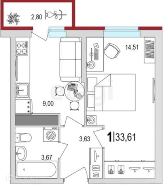 Комната 14,51кв, кухня 9кв, ванная/туалет 3,67кв, прихожая 3,63кв, балкон 2,8кв.