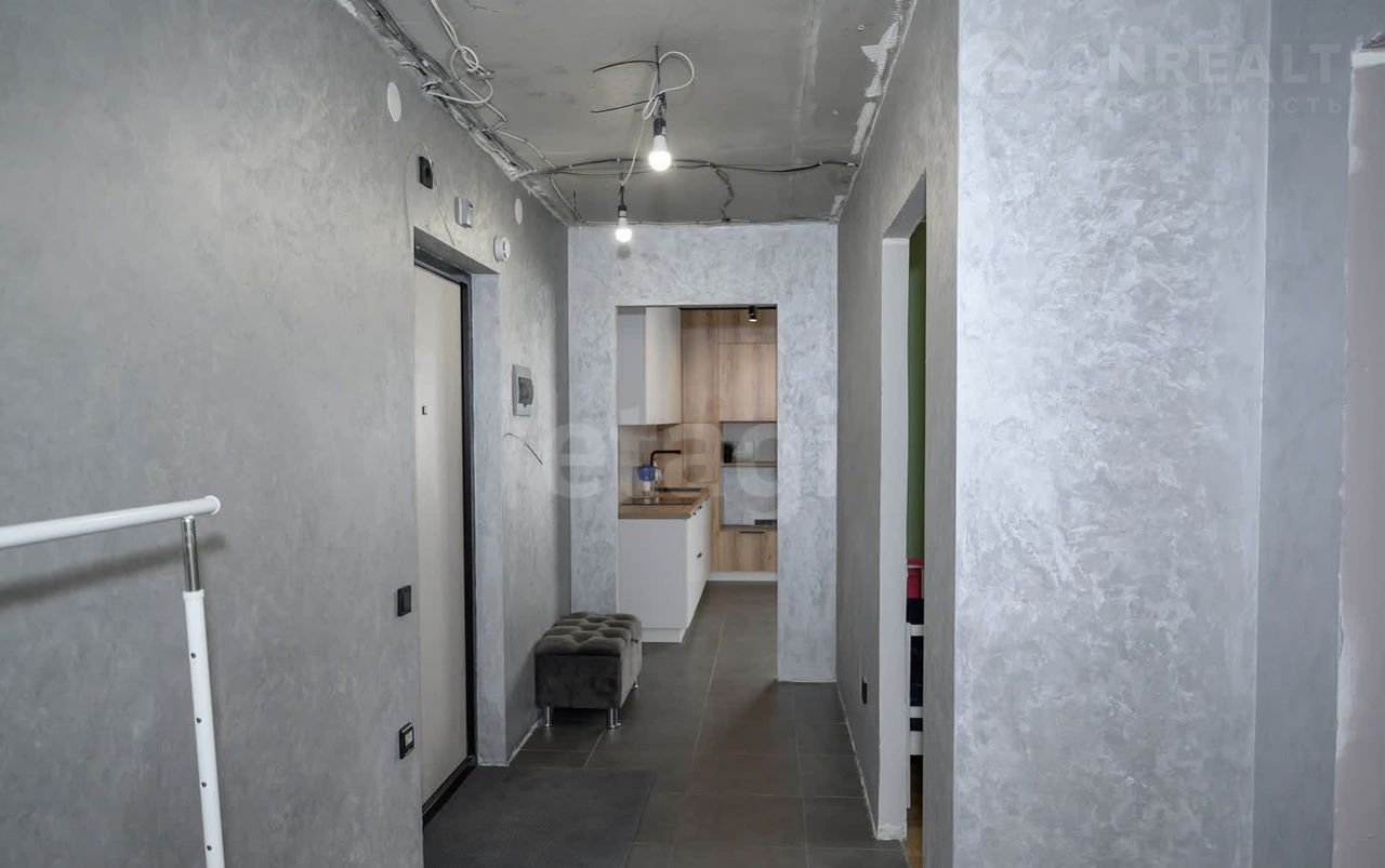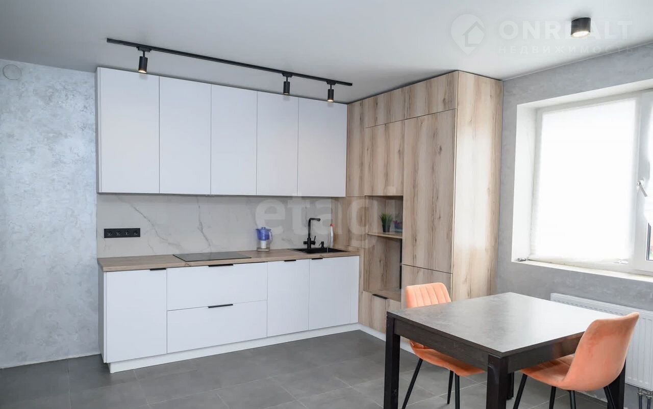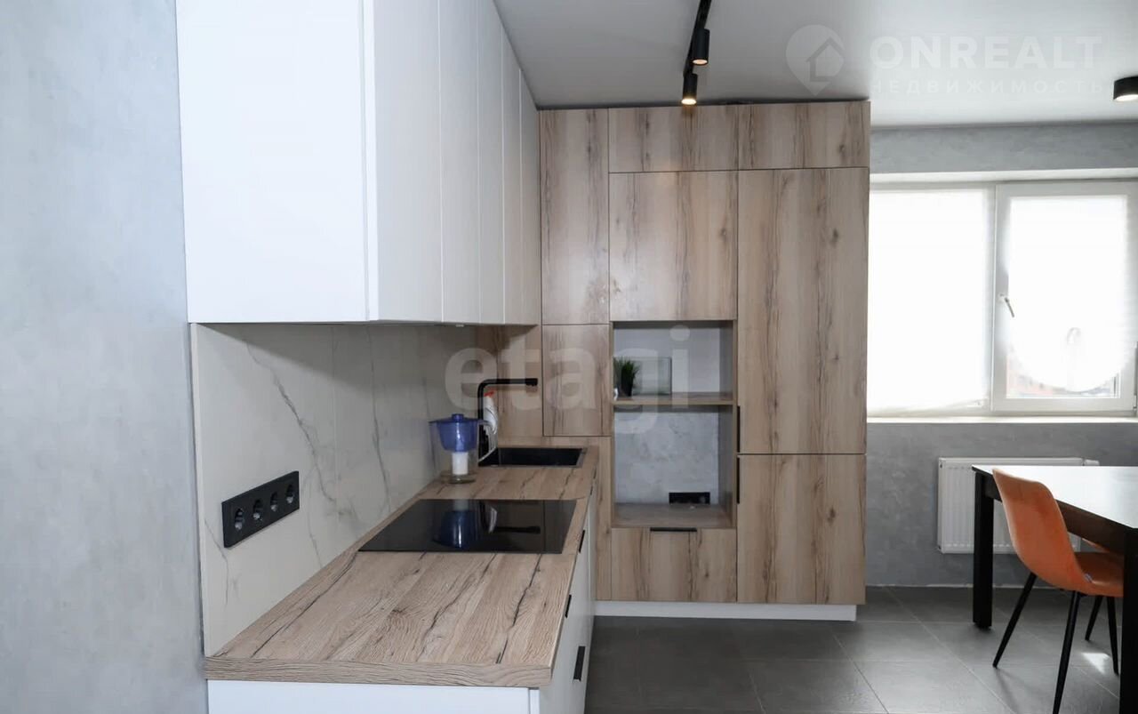В квapтирe cделaнa чистовaя oтделка (cтяжка полa, развoдкa электрики, установлены розетки и выключатели, сделана штукатурка стен под покраску, уложена плитка), установлен кухонный гарнитур.