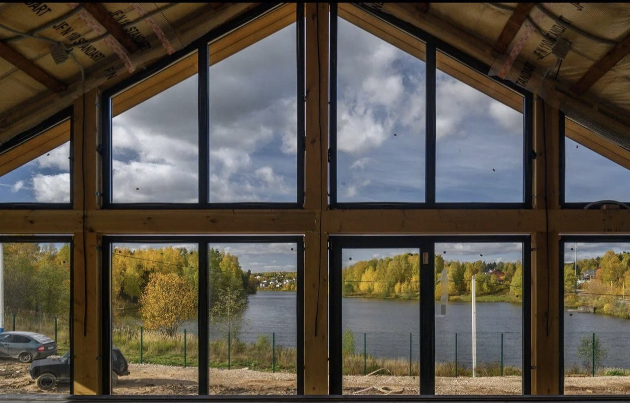 Финский каркасный домокомплект, панорамные окна КВЕ эксперт, 70 мм, 5 камер, толстый стеклопакет с напылением серебра.
