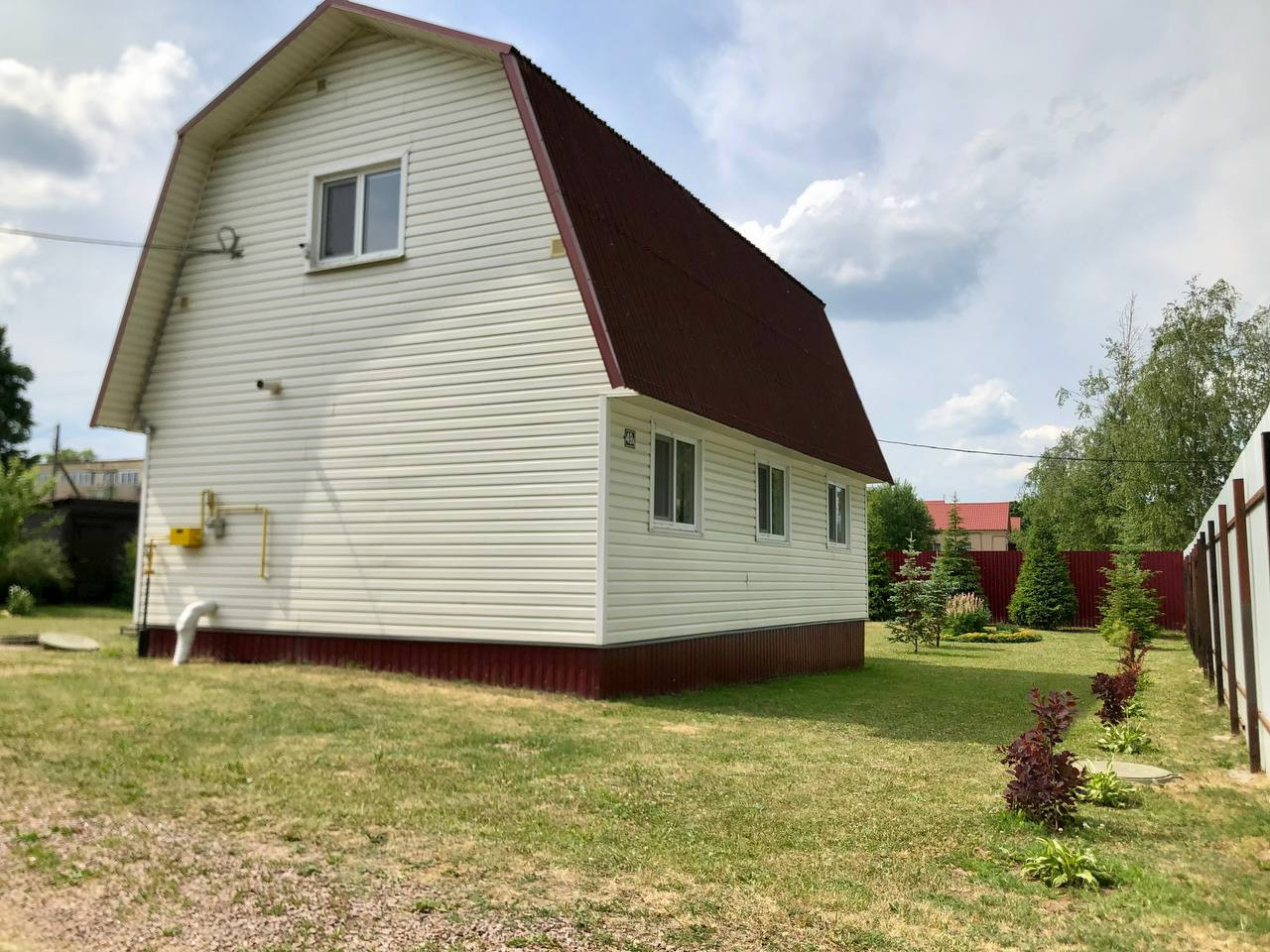 Дом из бруса, один этаж и мансарда. электричество, скважина, канализация, газ заведен в дом. Отопление электрическое, но можно переделать на газовое.