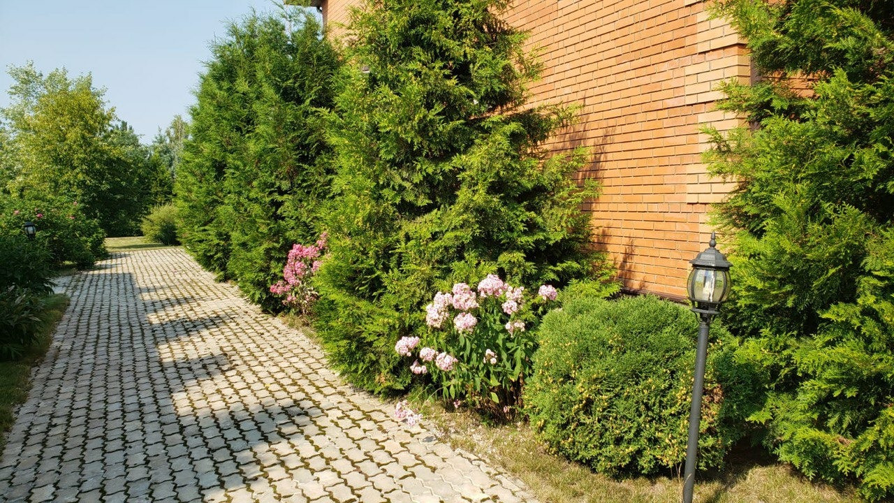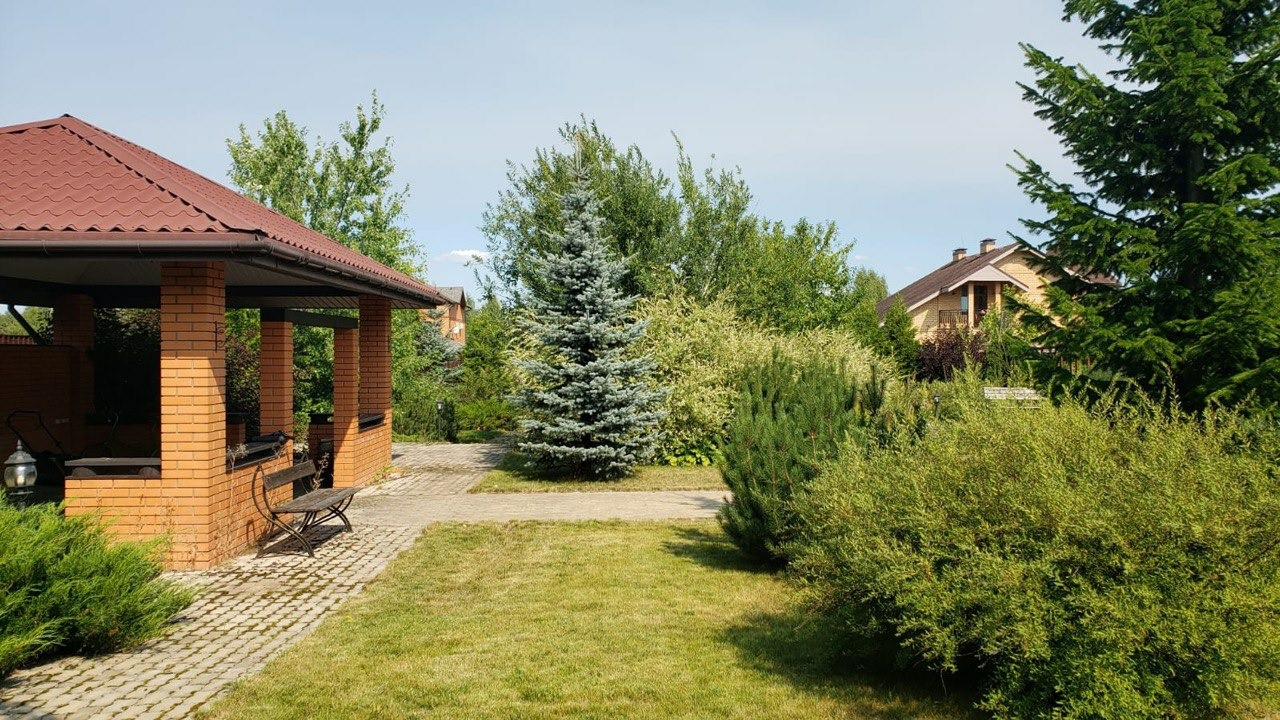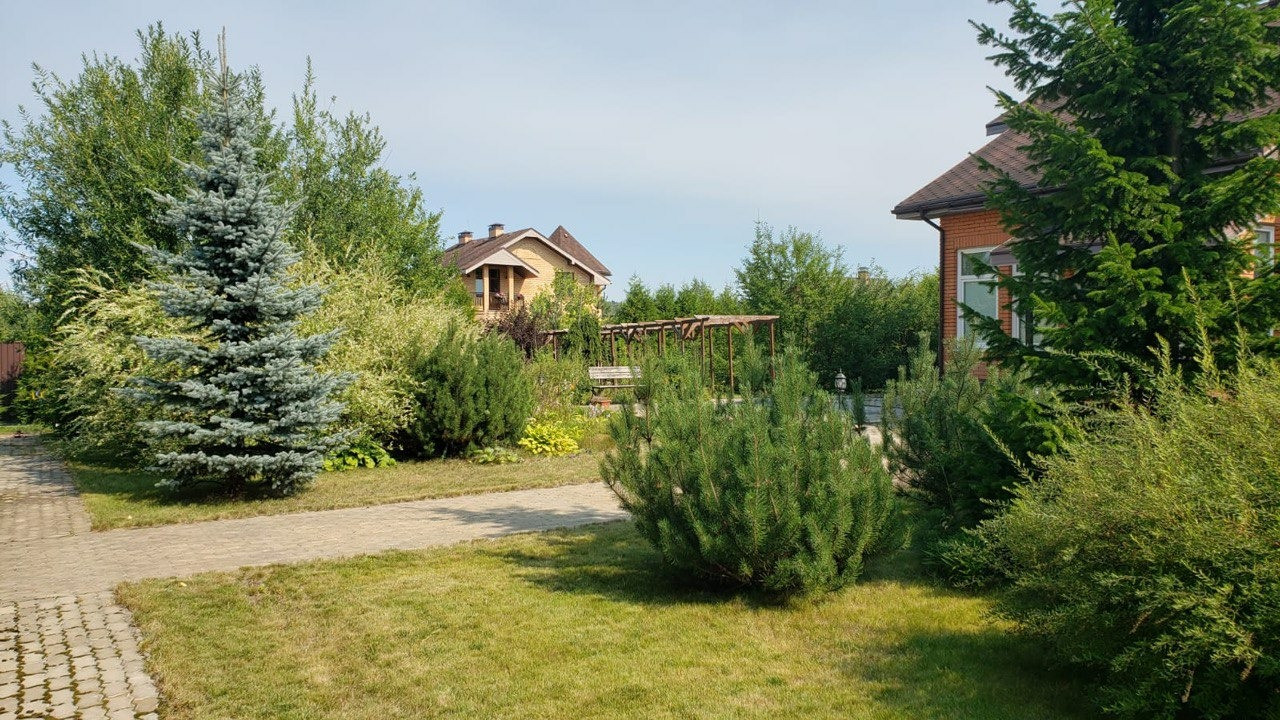 Дом расположен в центре поселка на участке 21.5 соток. Участок разноуровневый, с перепадом около 2 метров, паводковые воды не застаиваются .Участок ухожен, растениям и деревьям около 10 лет. Оформлены газонные участки с системой полива, есть автономная водяная скважина глубокого заливания. На участке дом, двухэтажный гараж на 2 а/м, кирпичная беседка, генераторный домик.